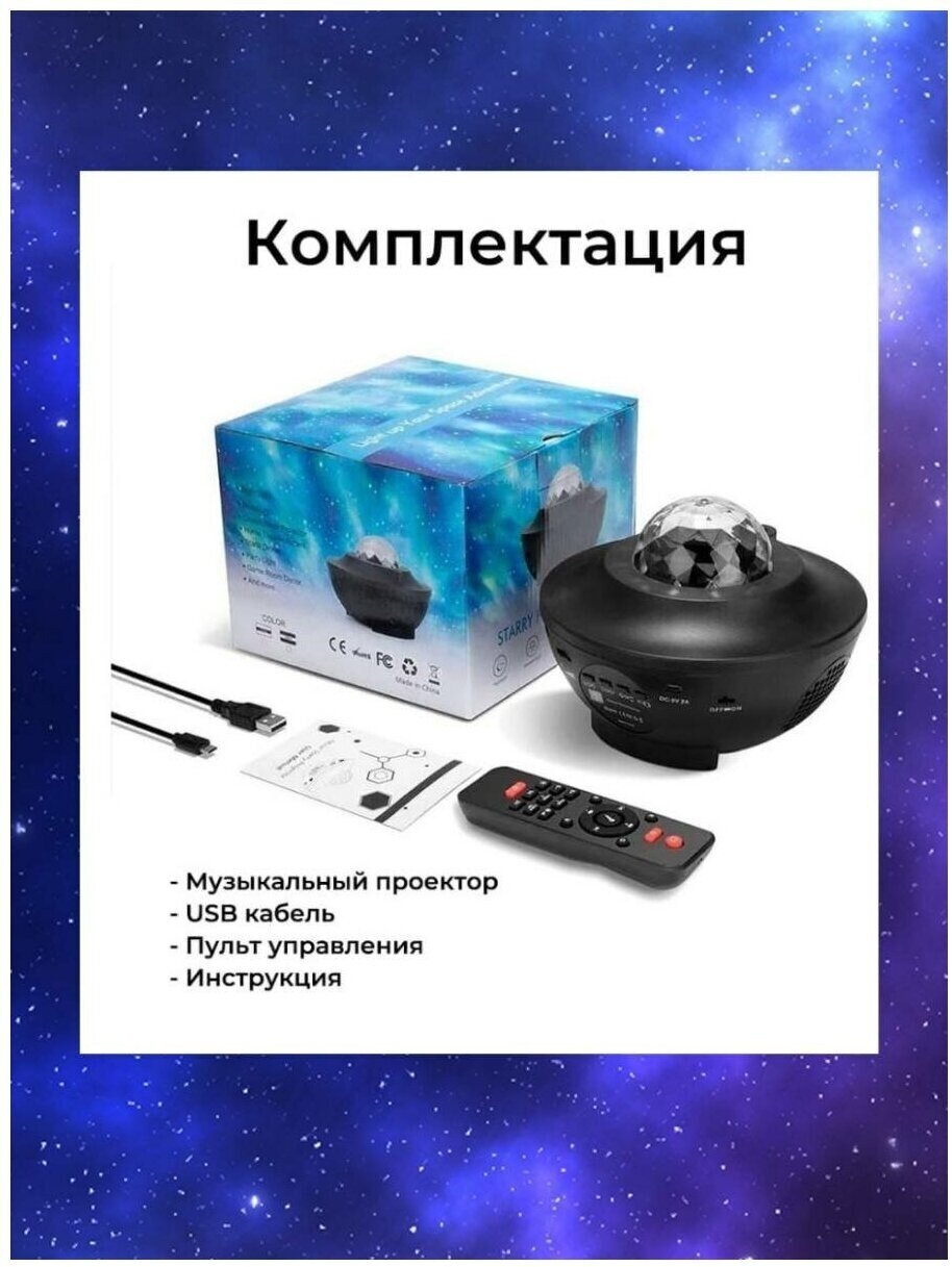 | Комплектация | Зарядное устройство USB-Type-C, пульт ДУ управления ночник , проектор-ночник звездного неба Bluetooth Star Projector Light. Коробка |