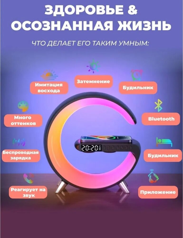 Ночник с беспроводной зарядкой, bluetooth-колонкой, часами и будильником. (белый)