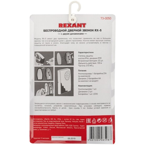 Звонок беспроводной Rexant RX-5, 2 приемника, 32 мелодий, 100 м REXANT 2582658 .