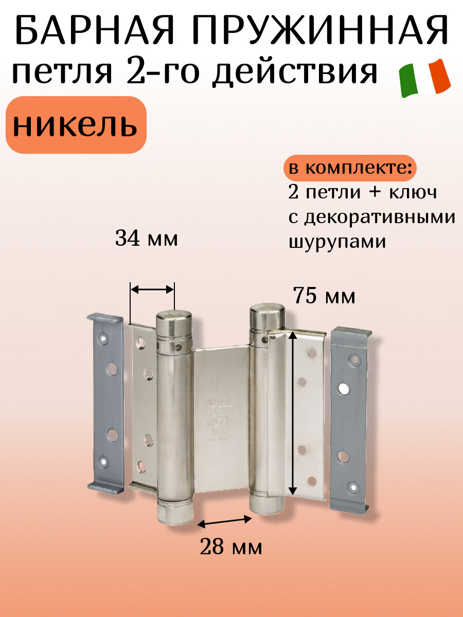 Барная пружинная петля двойного действия ALDEGHI LUIGI SPA 125х48х42 мм, цвет: никель, к-т: 2 шт + ключ с декоративными шурупами 101AN125B