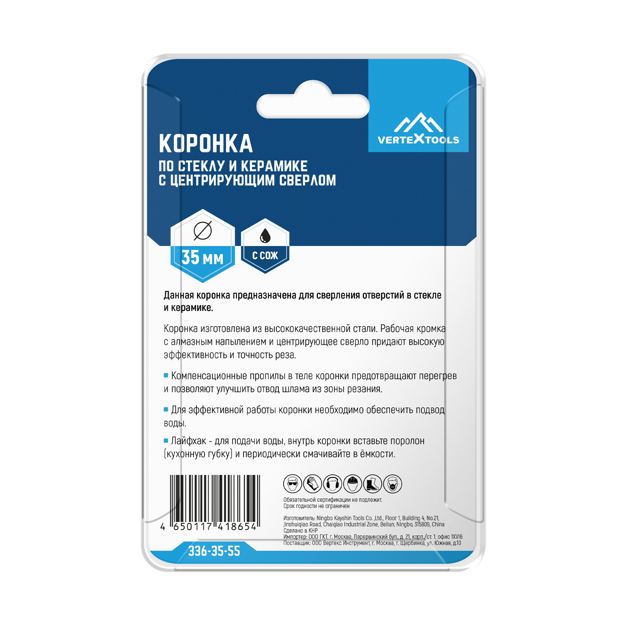 Купить Коронка по стеклу и керамике 35X55 VertexTools с центрирующим сверлом, CRv