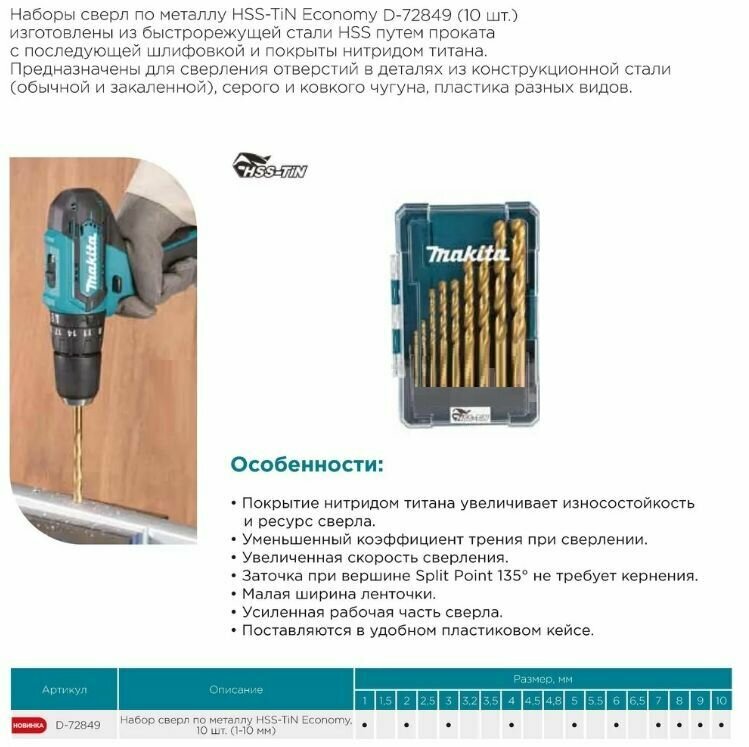 Набор сверл по металлу MAKITA HSS-TiN Economy 10 шт. 1-10 мм. (D-72849) интересное: