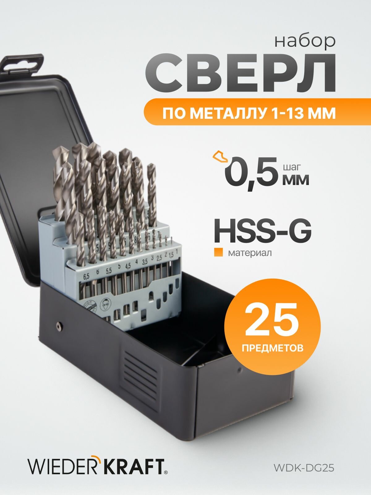 Набор сверл по металлу 1-13 мм, шаг 0.5 мм, HSS-G 25 предметов, металлический кейс WDK-DG25 интересное: