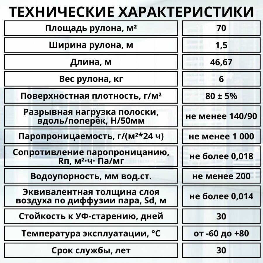 | Паропроницаемость | 5 г/(м²⋅сут) |