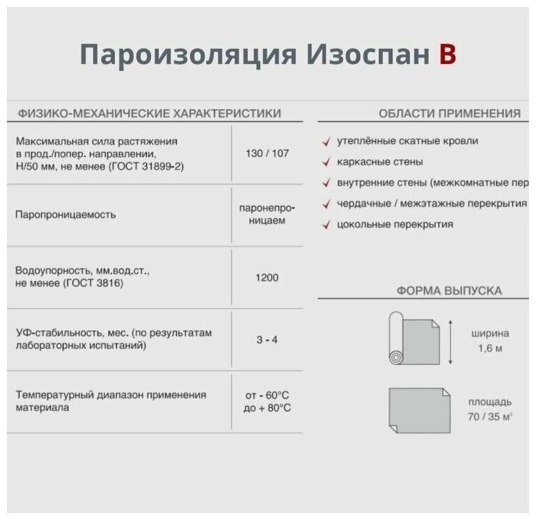 | Тип изоляции | ветроизоляция / гидроизоляция / пароизоляция |