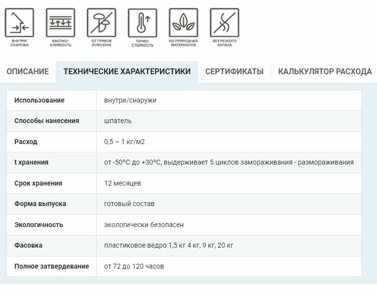 | Дополнительная информация | расход 0,5-1,7 кг/м²; выдерживает 5 циклов замораживания-оттаивания; пожаровзрывобезопасна; состав: связующее, инертный наполнитель, модифицирующие добавки |