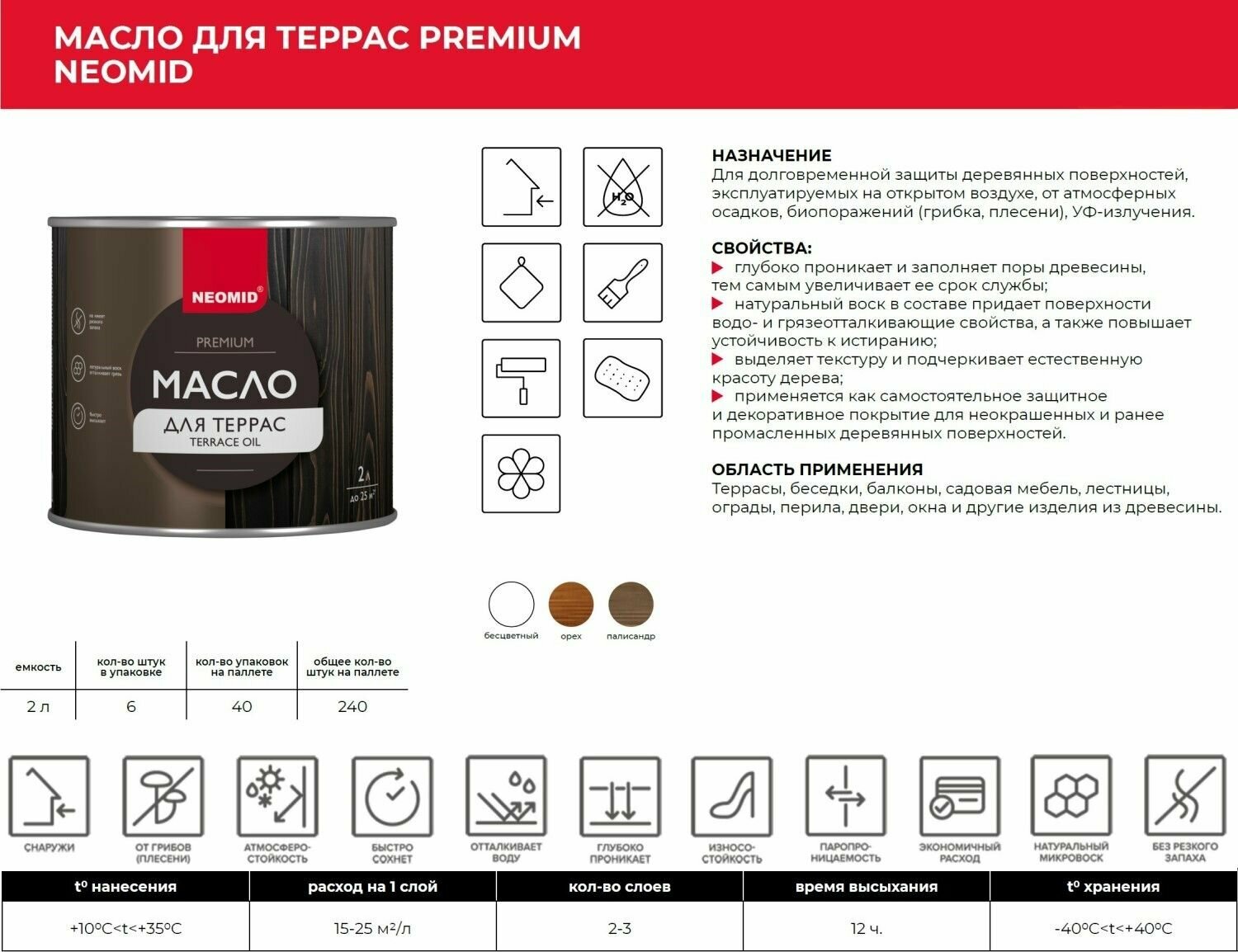 | Дополнительная информация | Масло для террас Neomid Premium цвет палисандр 2 л |