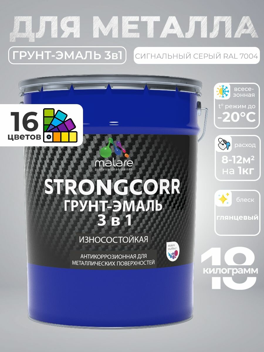 Грунт-Эмаль Malare 3 в 1 для металлических поверхностей, краска для металла, износостойкая, глянцевая, RAL 7004, сигнальный серый, 10 кг.