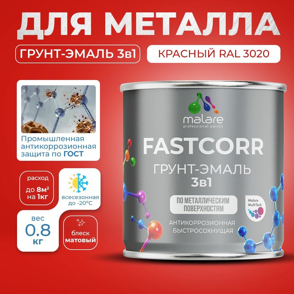 Купить Грунт-эмаль по ржавчине 3 в 1 Malare FastCorr краска для металла, антикоррозионная износостойкая быстросохнущая RAL 3020, красный, матовая, 0,8 кг.