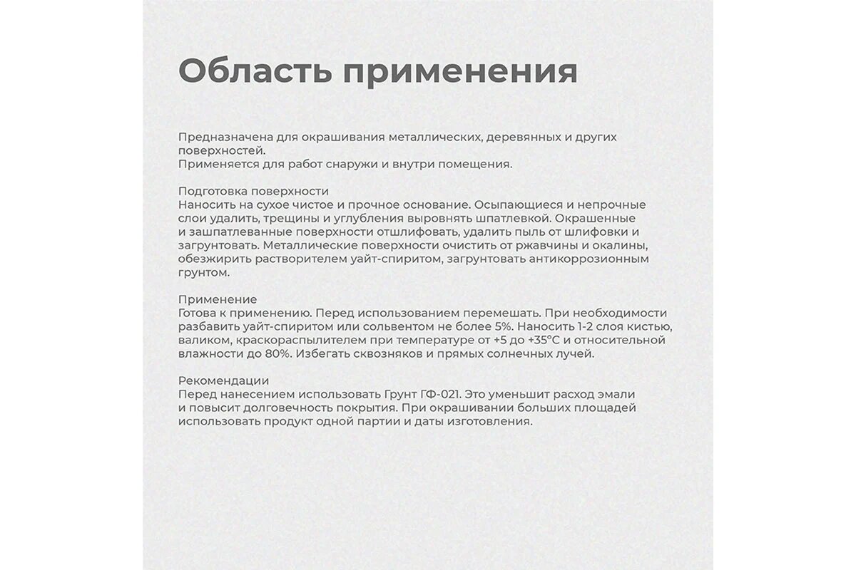 | Дополнительная информация | готова к применению, перед использованием перемешать, при необходимости разбавить уайт-спиритом или сольвентом не более 5%, наносить 1-2 слоя кистью, валиком, краскораспылителем при температуре от +5 до +35ºС и относительной влажности до 80% |