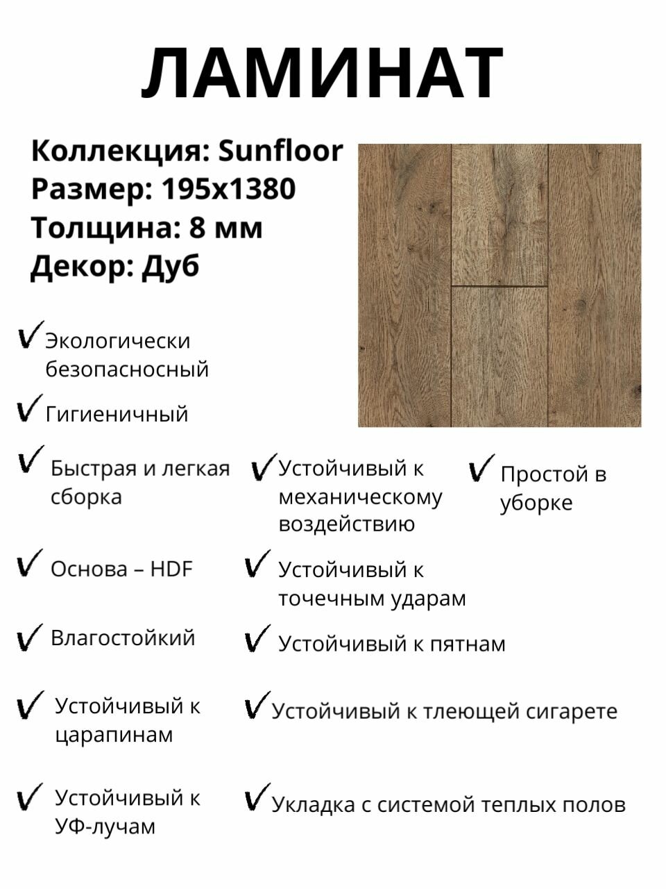 Ламинат Sunfloor Дуб Джонсон, влагостойкий, однополосный, 32 класса, 195x138 см, 2,153 м²