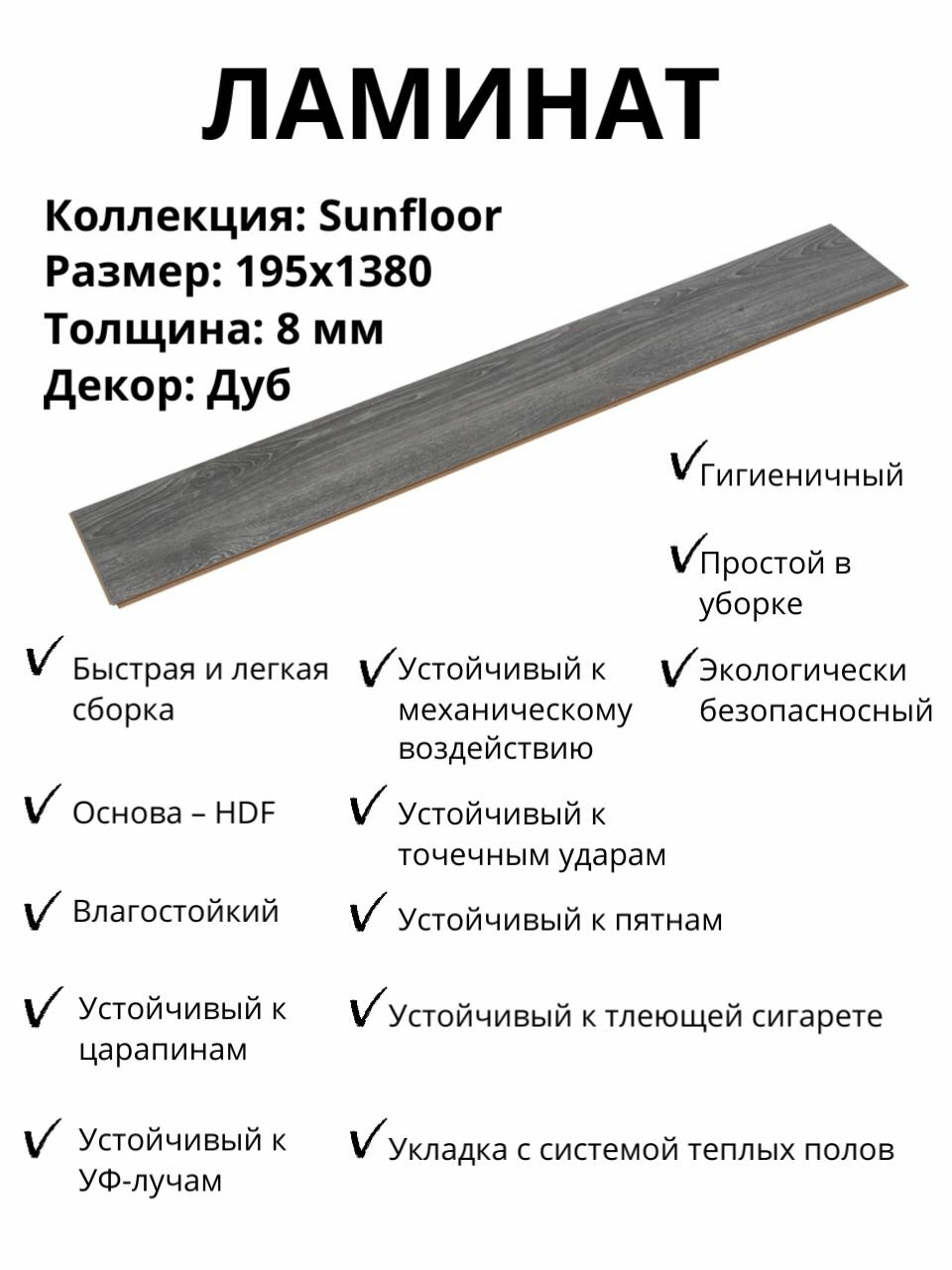 Ламинат Sunfloor Дуб Джонсон, влагостойкий, однополосный, 32 класса, 195x138 см, 2,153 м²