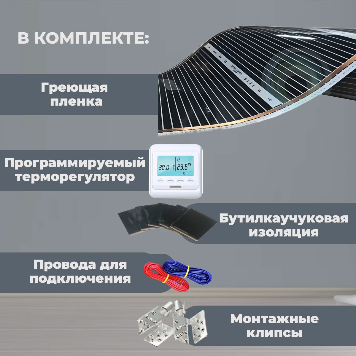 Пленочный теплый пол 1 м.п. комплект ширина 80см с электронным терморегулятором