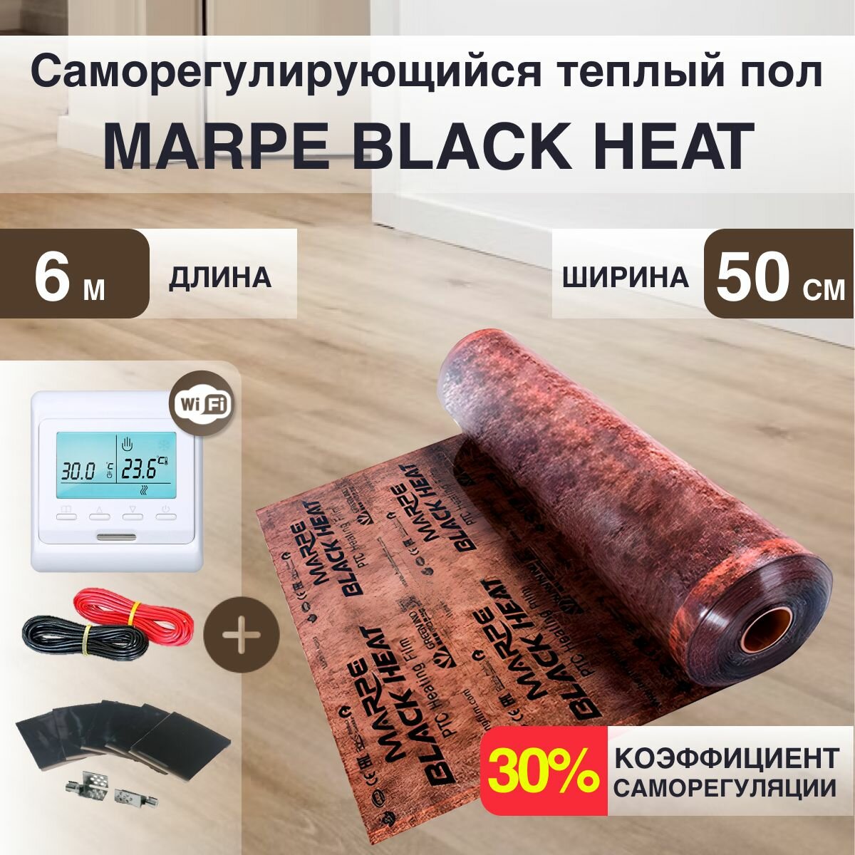 Саморегулирующийся инфракрасный теплый пол 3 м.кв. MARPE Black Heat 50 см ширина, комплект элит с терморегулятором