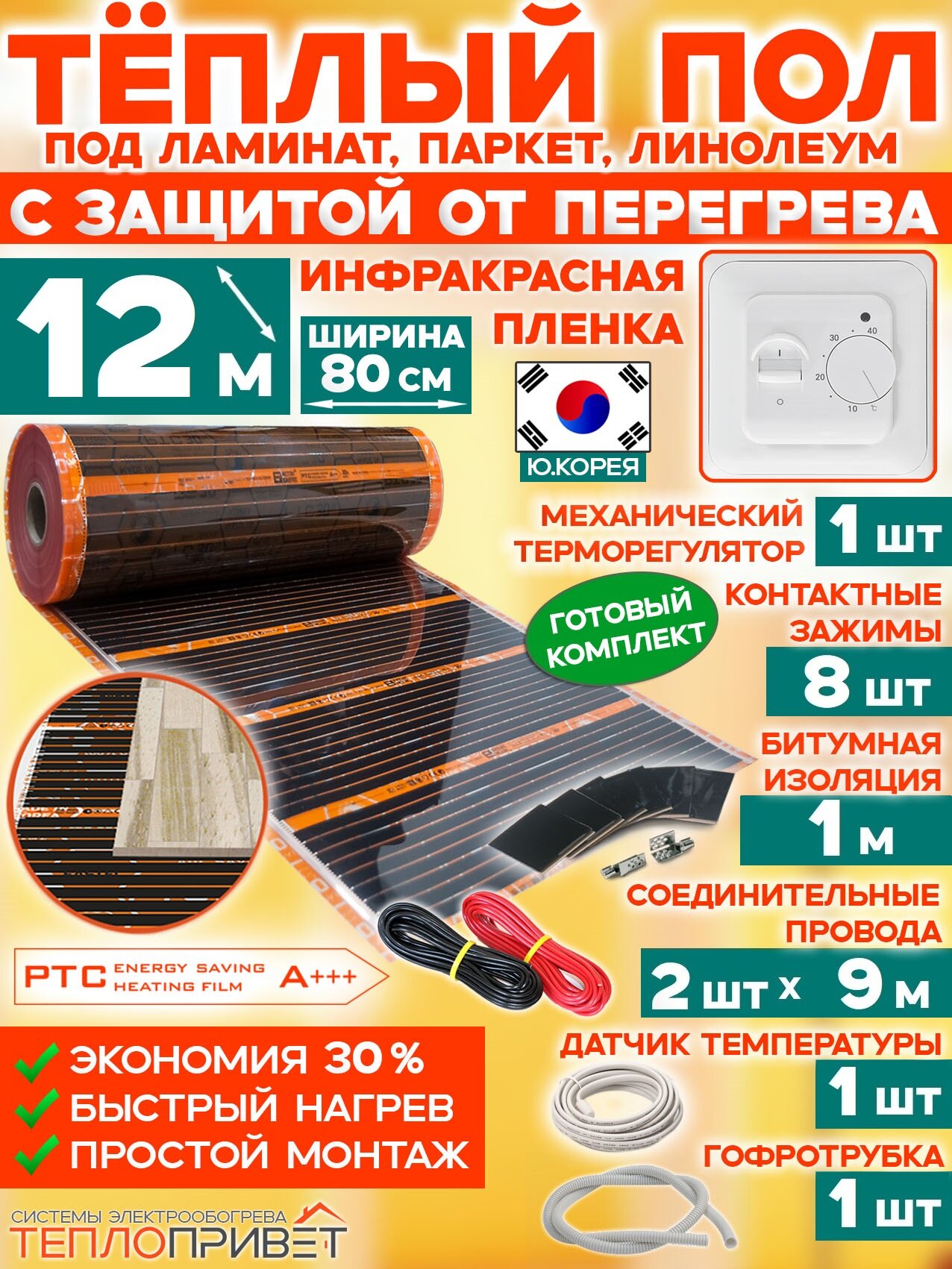 Инфракрасный теплый пол Eastec PTC 15 м х 80 см 2640 Вт комплект саморегул. TLS-80-15 + механический терморегулятор