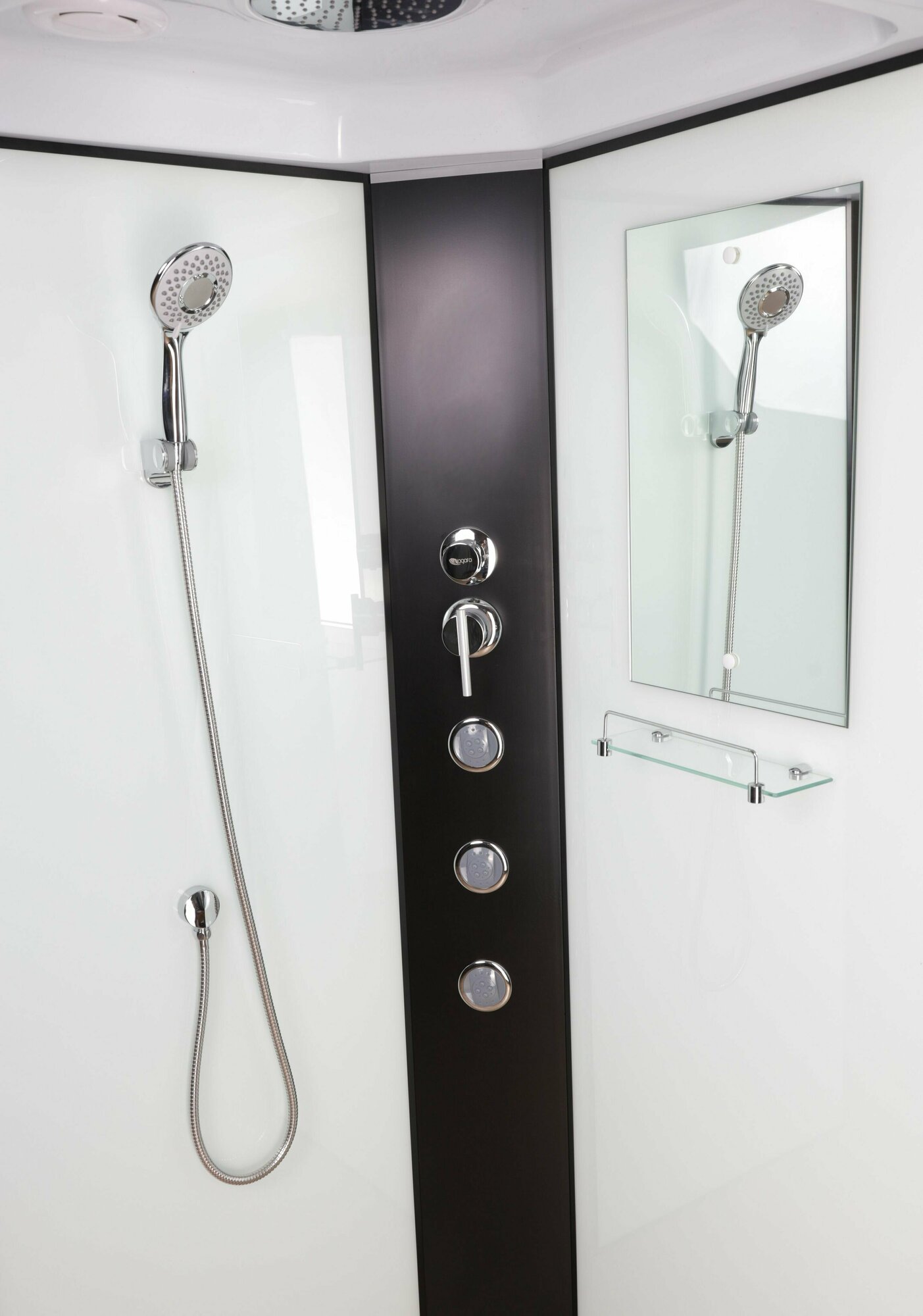 | Комплектация | душевая лейка, зеркало, полки, сиденье |