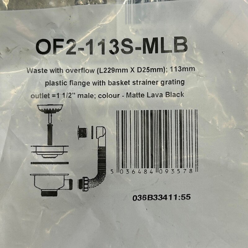 Слив-перелив Mcalpine OF2-113S-MLB, L=235 х 25 мм, 113 мм реш., вых. 1 1/2", для раковины кр.отв., черный мат.лава