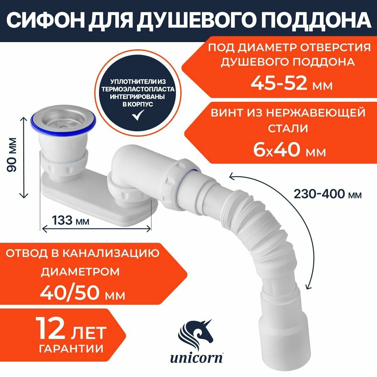 Сифон для душевого поддона UNICORN G22 с прикруч.выпуском 1 1/2 и гибк.соедин. 40х40/50 400 мм