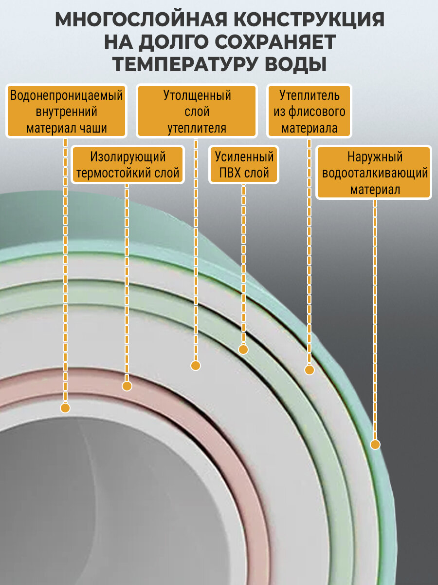| Подробная комплектация | Утепленная жемчужным хлопком чаша - 1шт; Инструкция на русском языке - 1шт; Гофрированный патрубок - 1шт; Водяная подушка - 1шт; Опорная ножка каркаса - 6 шт; Соединительный тройник каркаса - 6 шт; Угловой элемент каркаса верхнего борика - 4 шт; Горизонтальный элемент каркаса верхнего борика - 2 шт |