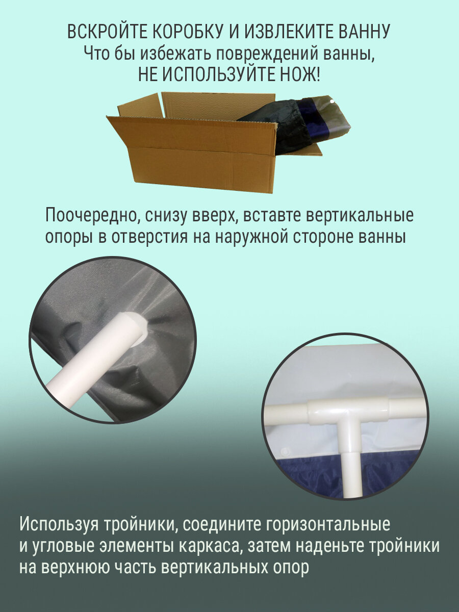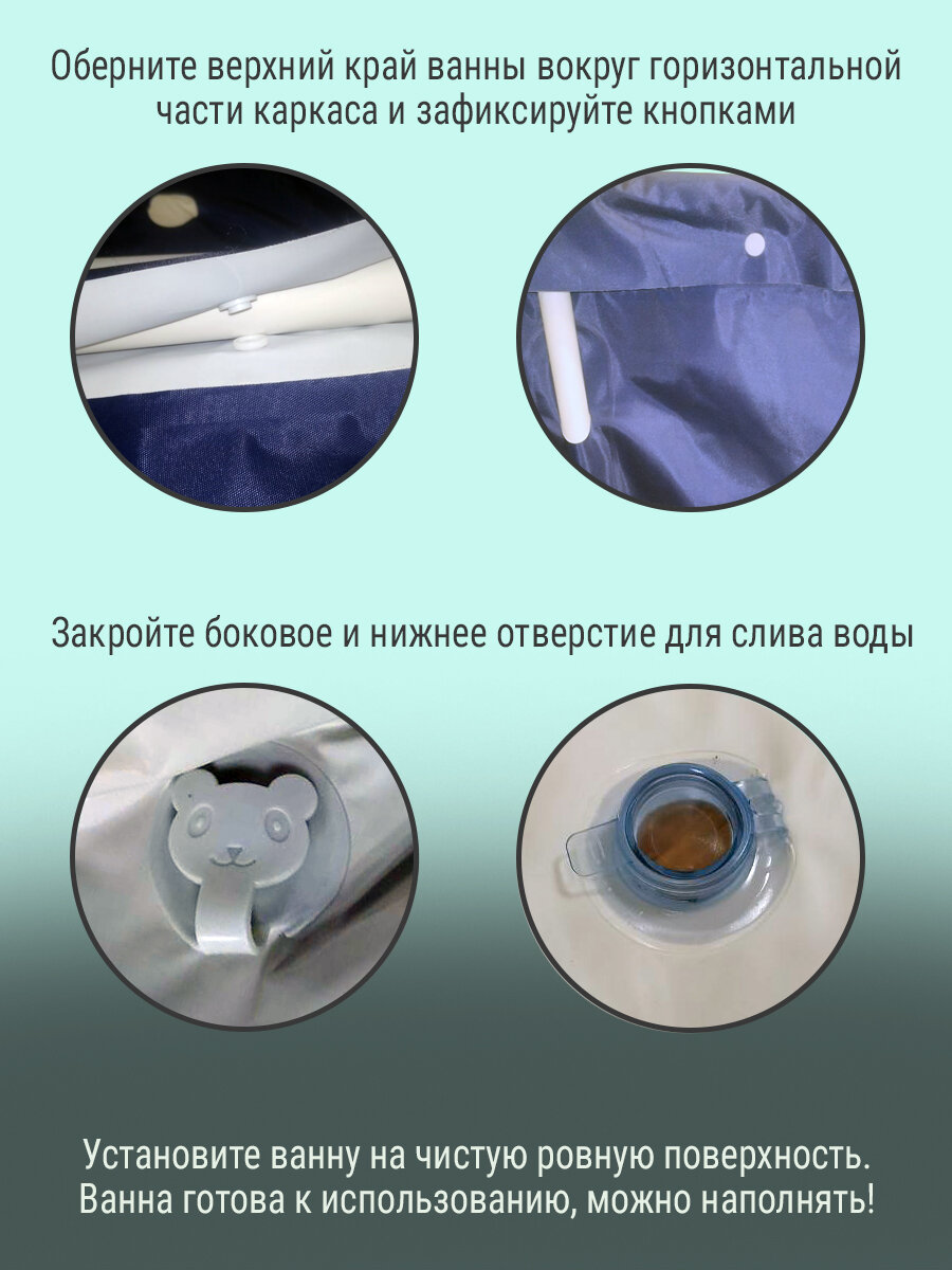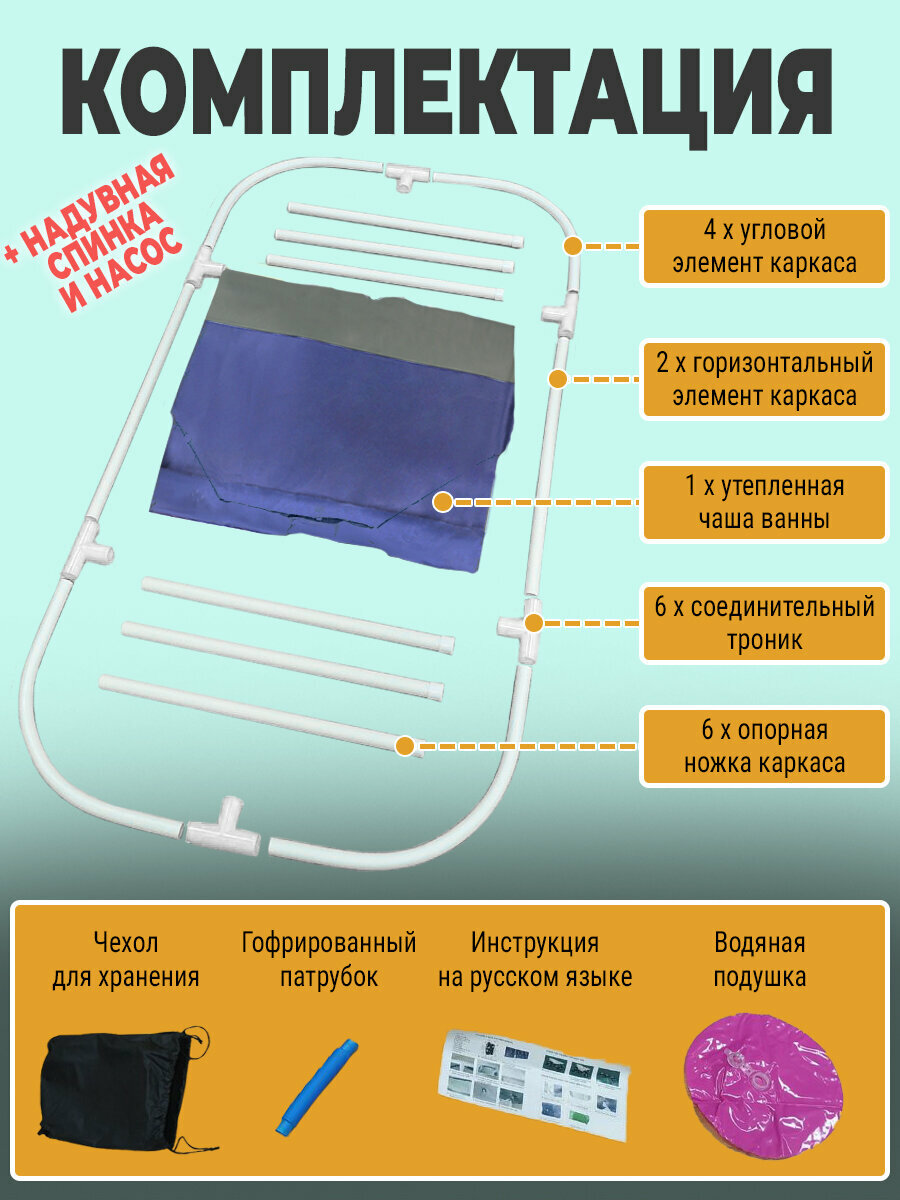 | Дополнительная информация | ванна не требует сборки, поставляется в сборе со складным каркасом; ванна снабжена боковым и донным клапаном для слива воды; рекомендуемый объем наполнения чаши - 2/3 от высоты бортика |