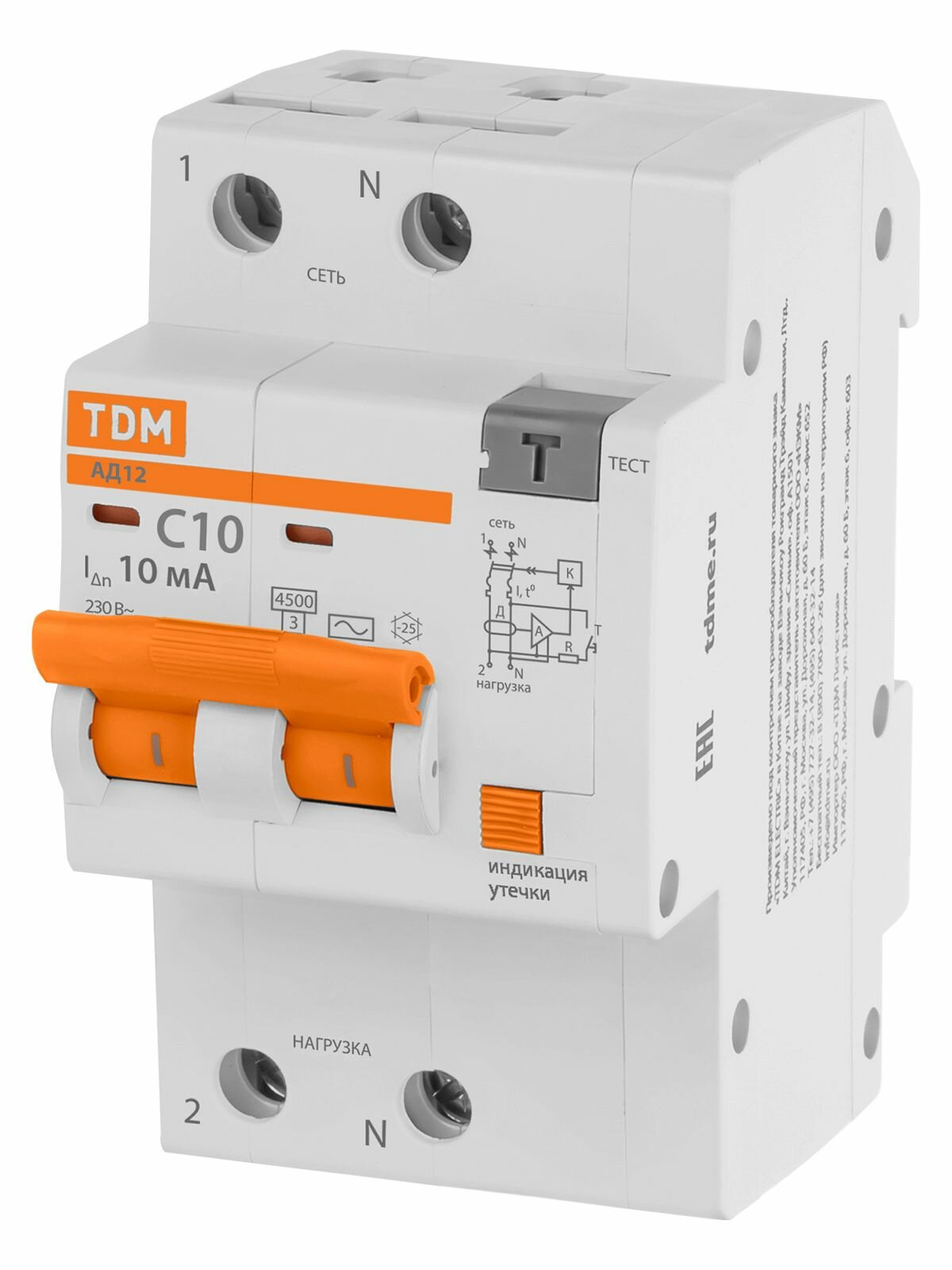 Дифференциальнай автомат АД12 2Р 10А 10мА, TDM SQ0204-0102 (1 шт.)