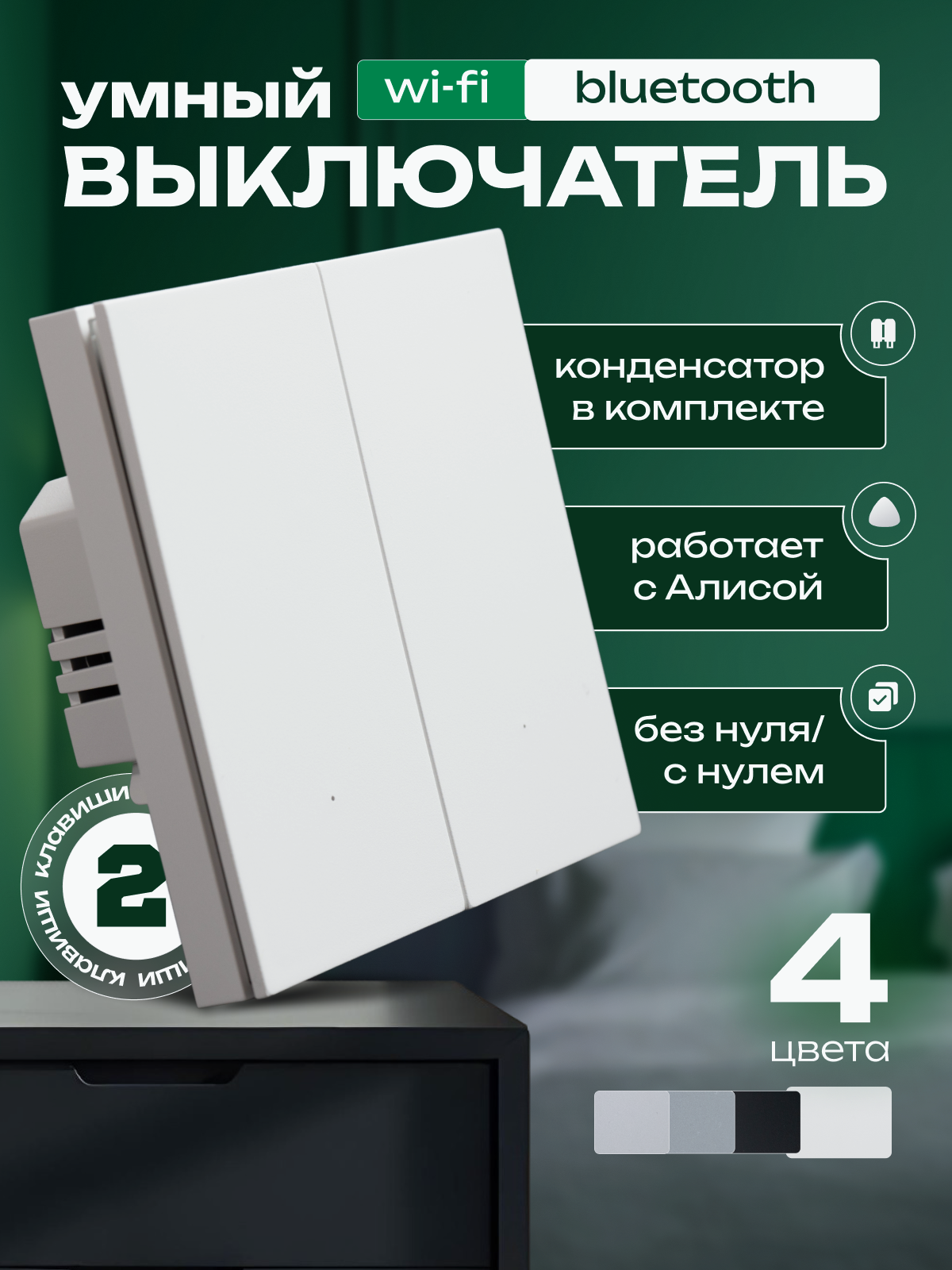 СохранитьУмный выключатель двухклавишный белый Wi-Fi + Bluetooth, универсальный (конденсатор в комплекте) интересное: