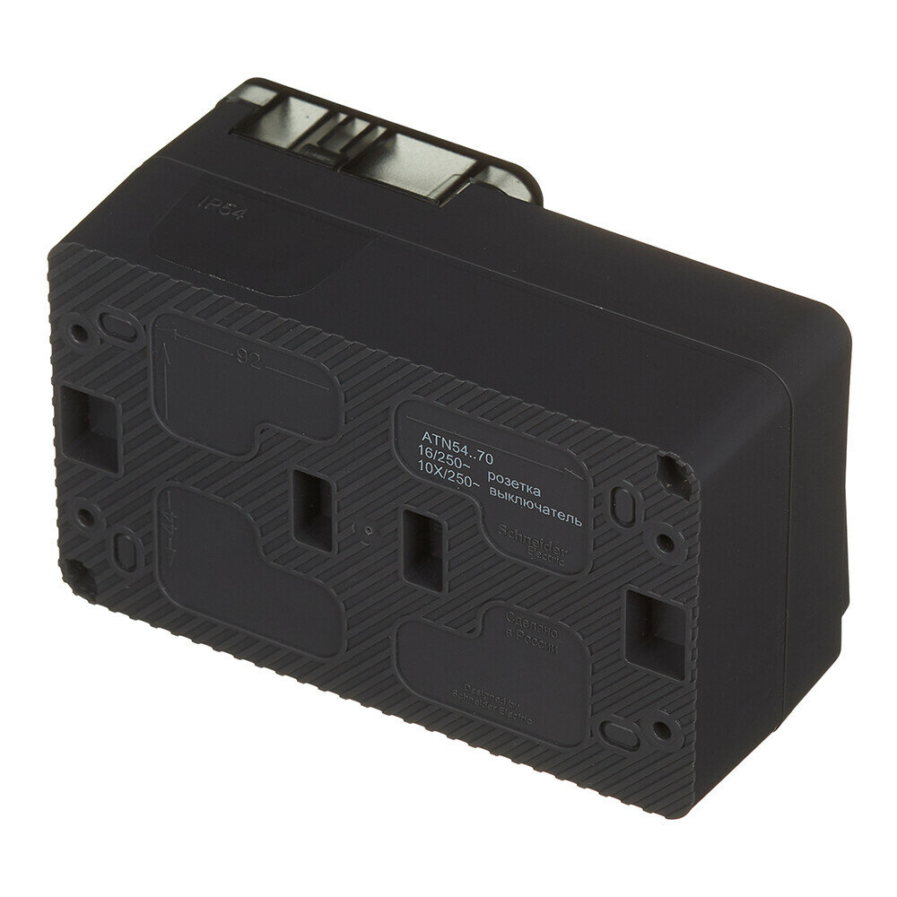 Блок выключатель + розетка уличная IP54, пылевлагозащищенная электрическая 2-клавишная Schneider Electric (Systeme Electric) Atlas Design с заземлением, с защитными шторкми, 16А, Антрацит - 1 шт.