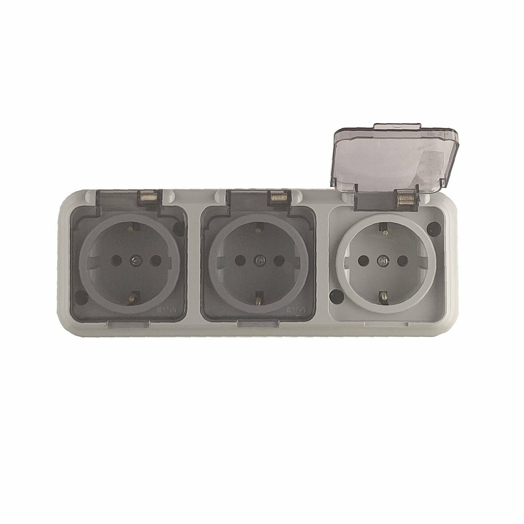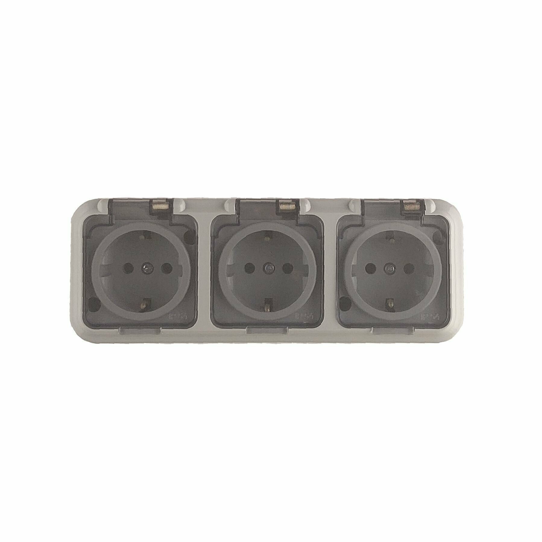 Купить Розетка Наружная Тройная С Заземлением + Прозрачная Крышка Серый IP54 16A 220v Пралеска Bylectrica