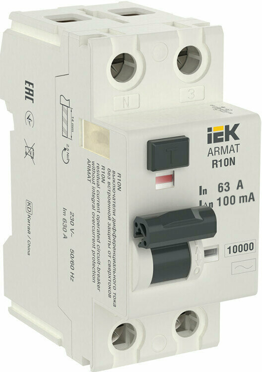 ARMAT Выключатель дифференциального тока R10N (УЗО) 2п 63А 30мА тип AC , IEK AR-R10N-2-063C030 (1 шт.)