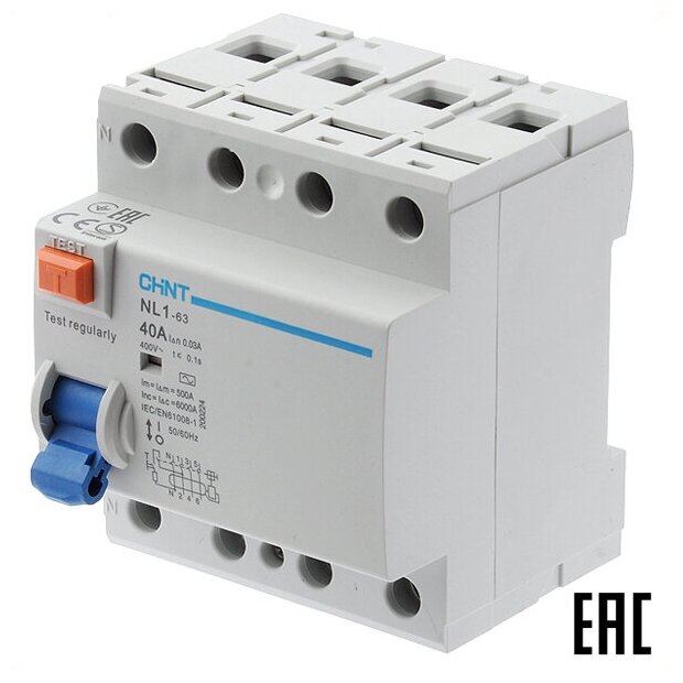 УЗО CHINT NL1-63 6kA 4P 30mA тип AC, 40 А, 30 мА, 4 полюса