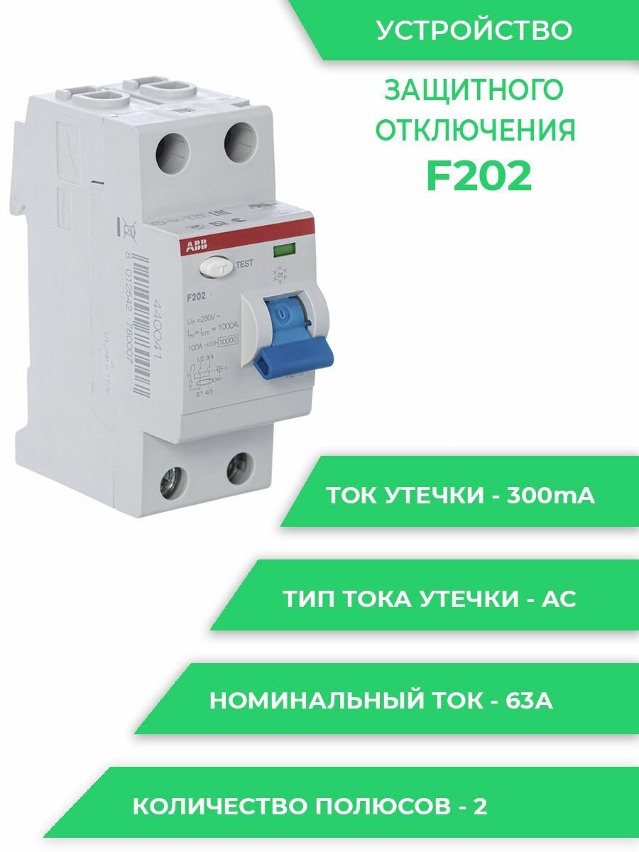 Устройство защитного отключения (УЗО) ABB F200, 2 полюса, 63A, 300 mA, тип AC, электро-механическое, ширина 2 DIN-модуля