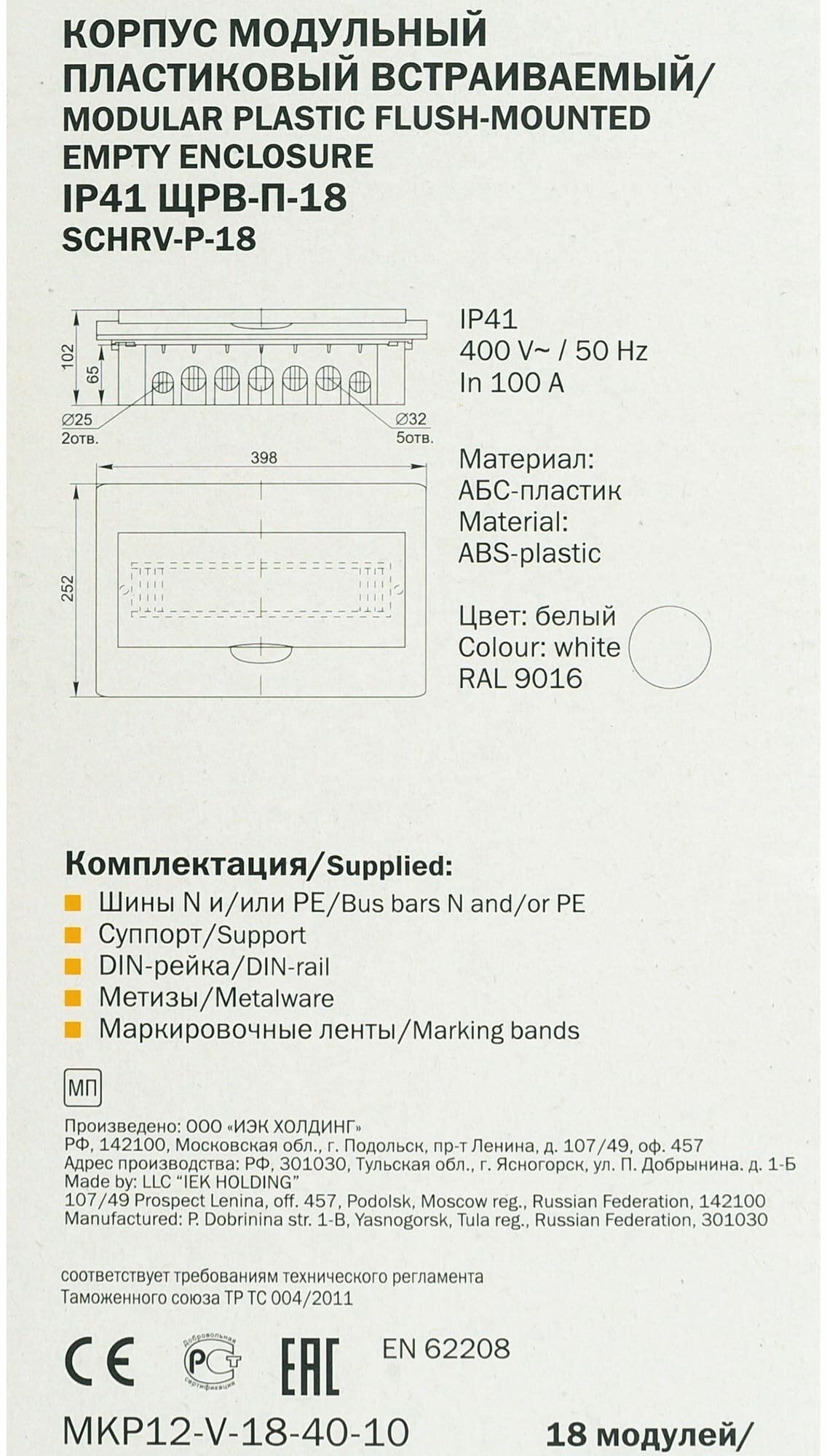 Щит распределительный IEK MKP12-V-18-40-10 ЩРВ-П-18 для установки модульных устройств встраиваемый 398мм 87мм 252мм 660B 18мод. пластик IP41 белый (уп