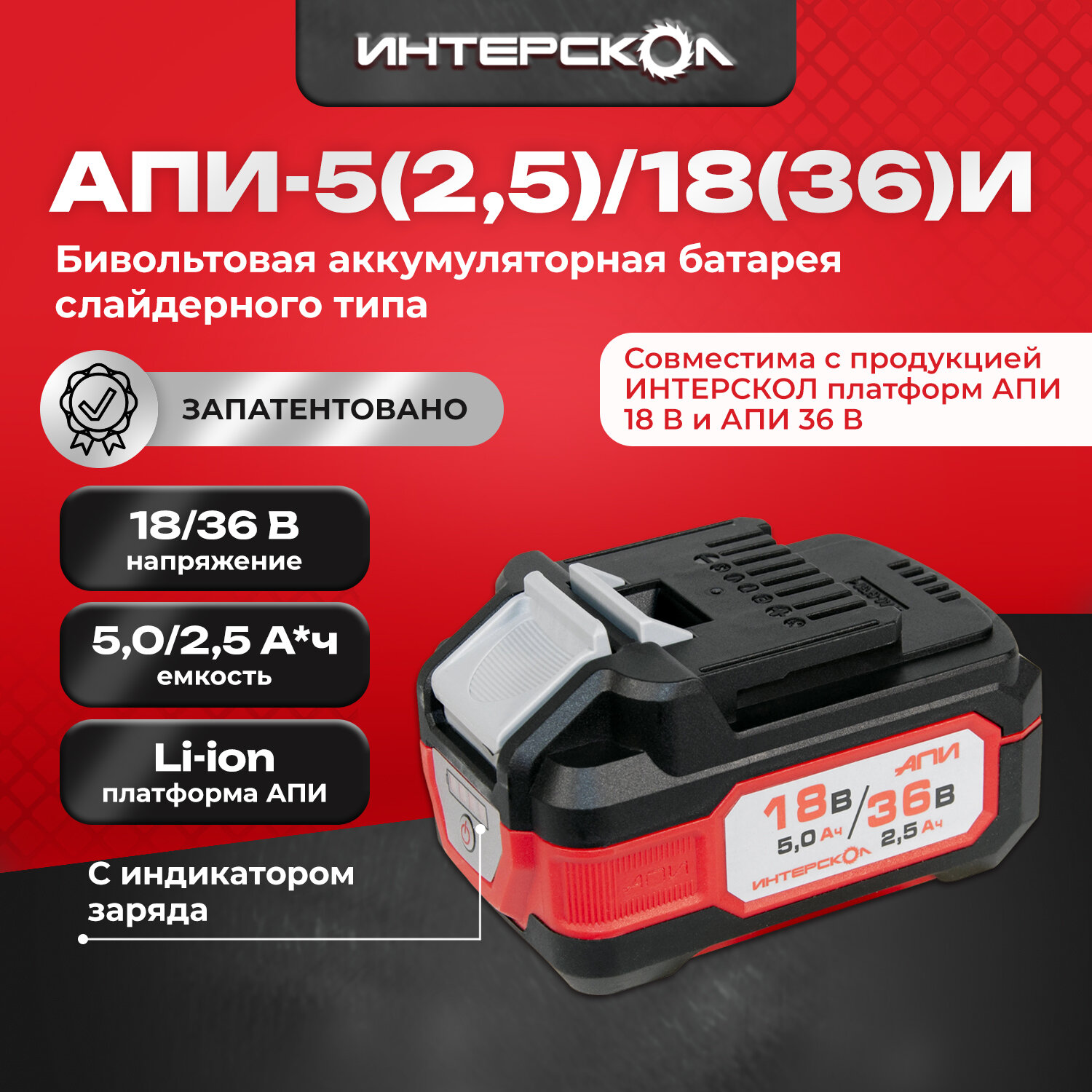 СохранитьАккумуляторный слайдерный блок ИНТЕРСКОЛ АПИ-5(2,5)/18(36)И, Li-Ion, 18/36 В, 5/2.5 Ач, 1 шт. (2400.205) интересное: