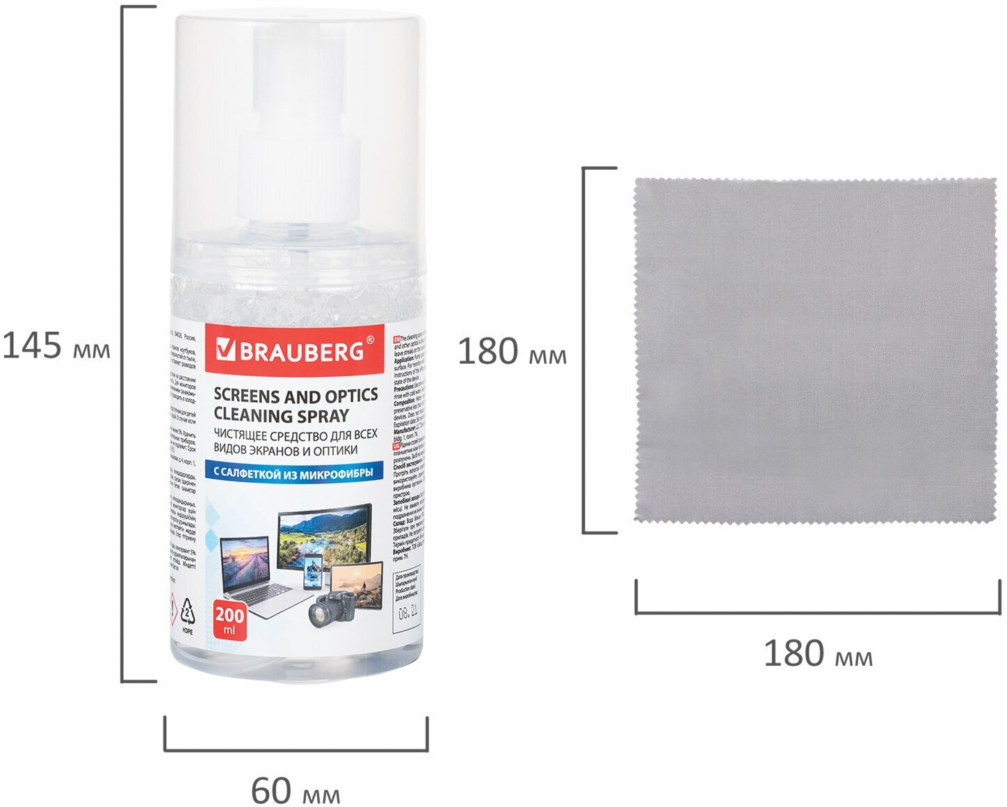 Чистящий набор для экранов всех типов и оптики BRAUBERG, комплект салфетка и спрей, 200 мл, 513560, наш интересное: