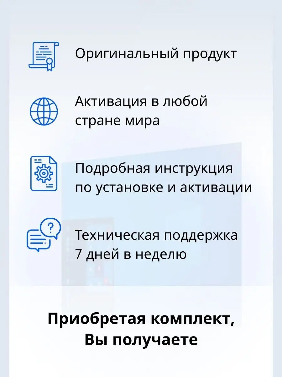 | Дополнительная информация | Комплектация - ключ активации windows 10 pro;Ссылка на скачивание;Инструкция по установке(текст+видео);гарантийный талон;загрузочная флешка |