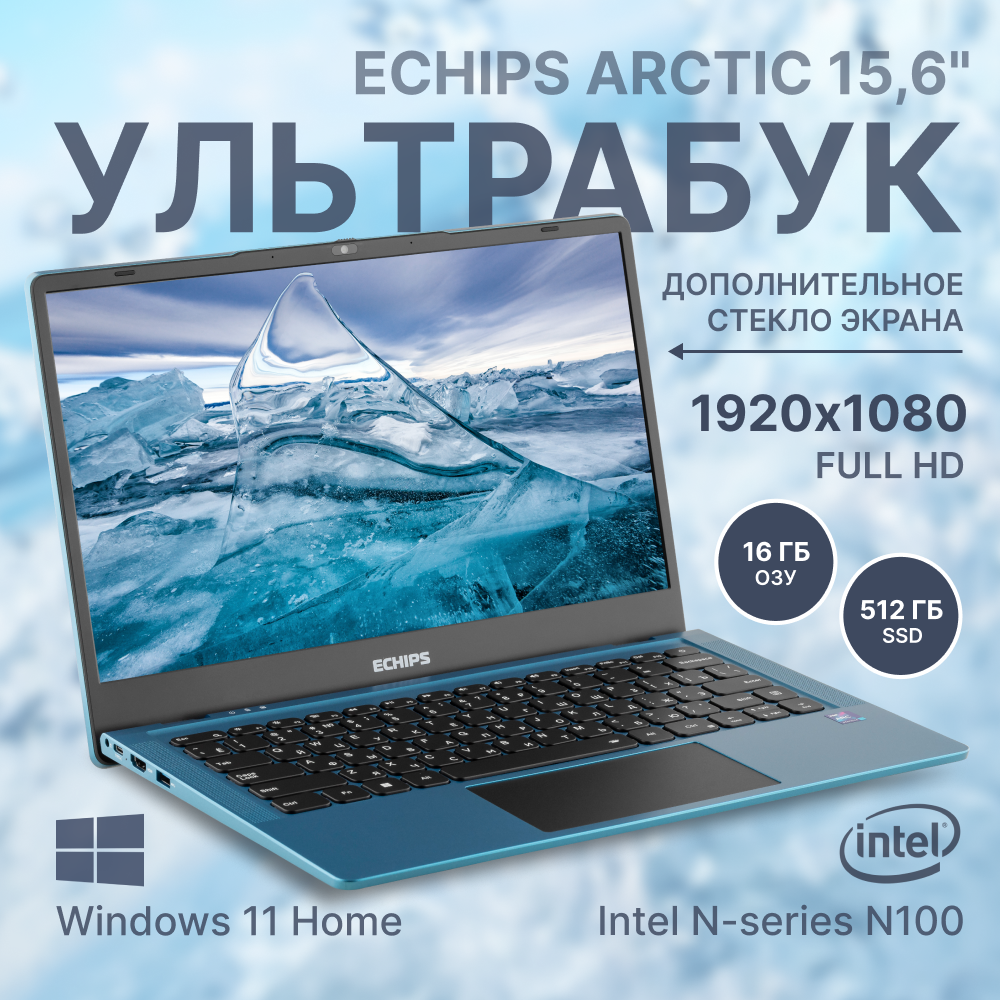 Купить Ноутбук для работы и учебы 15.6" Echips Arctic, Intel Processor N100, RAM 16 ГБ, SSD 512 ГБ, Intel UHD Graphics, Windows Home, синий, Русская раскладка, с подсветкой клавиатуры