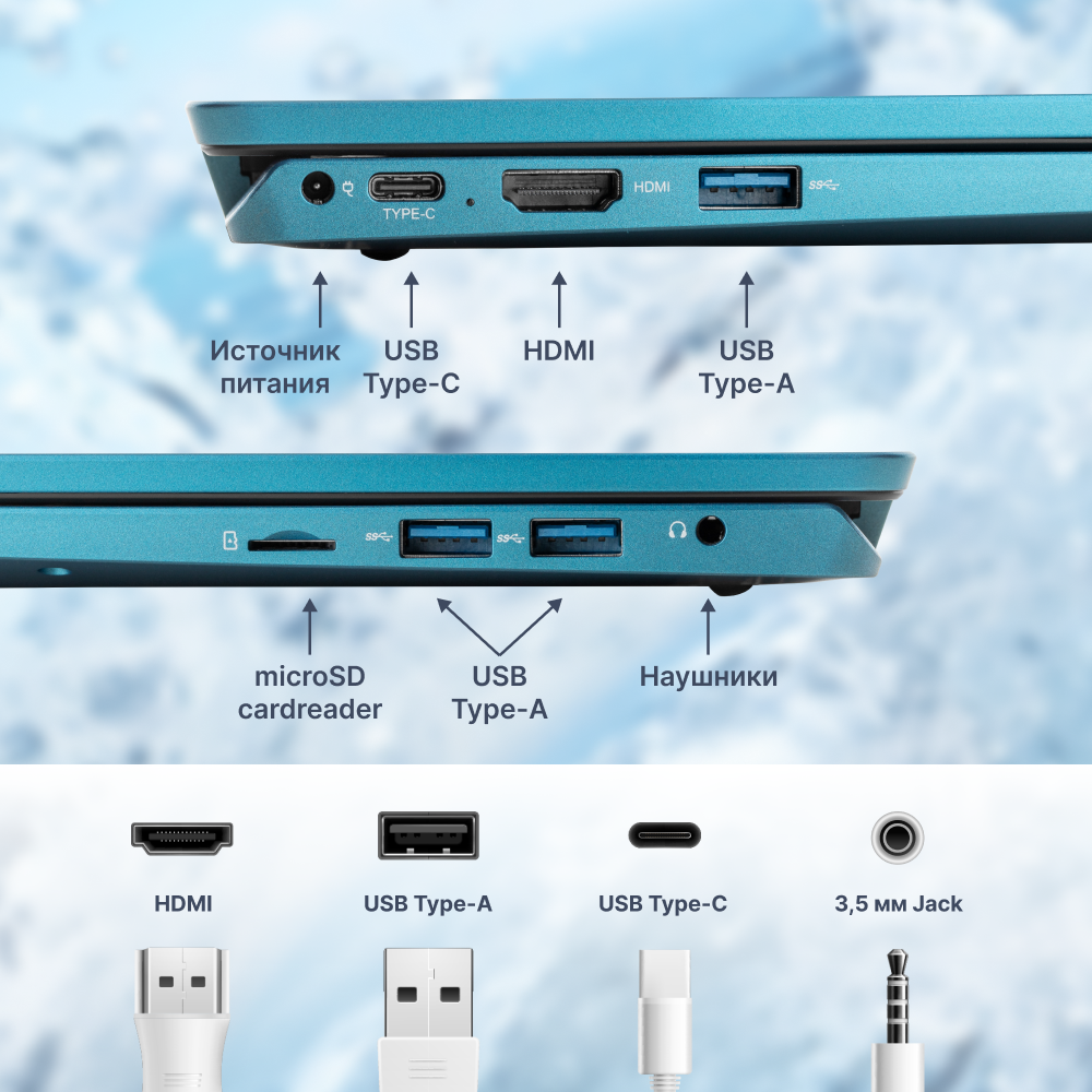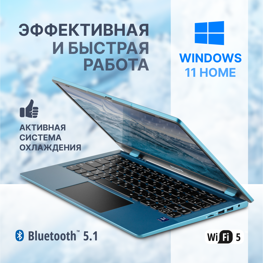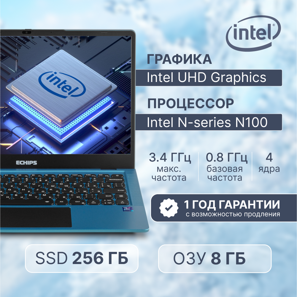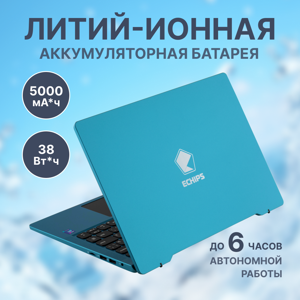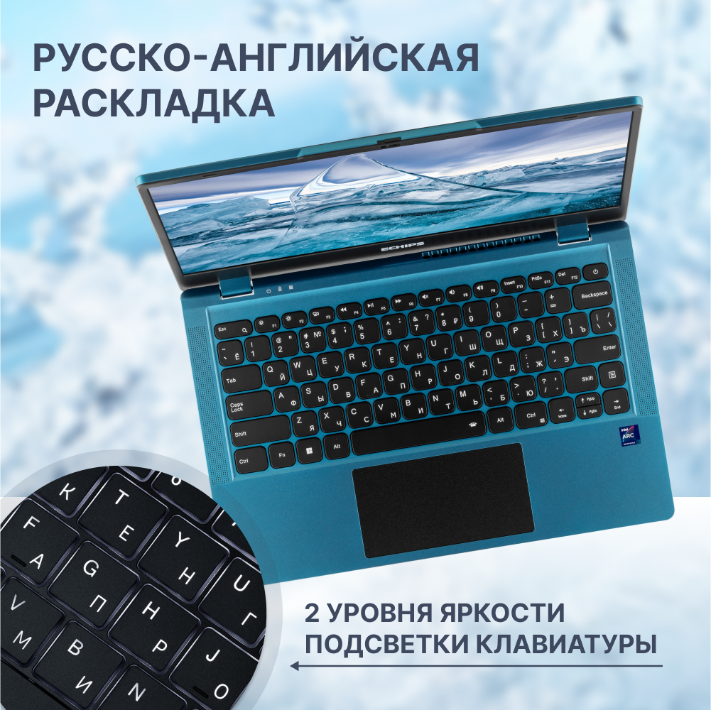Ноутбук для работы и учебы 14.1" Echips Arctic, Intel Processor N100, RAM 8 ГБ, SSD 256 ГБ, Intel UHD Graphics, Windows Home, синий, Русская раскладка, с подсветкой клавиатуры