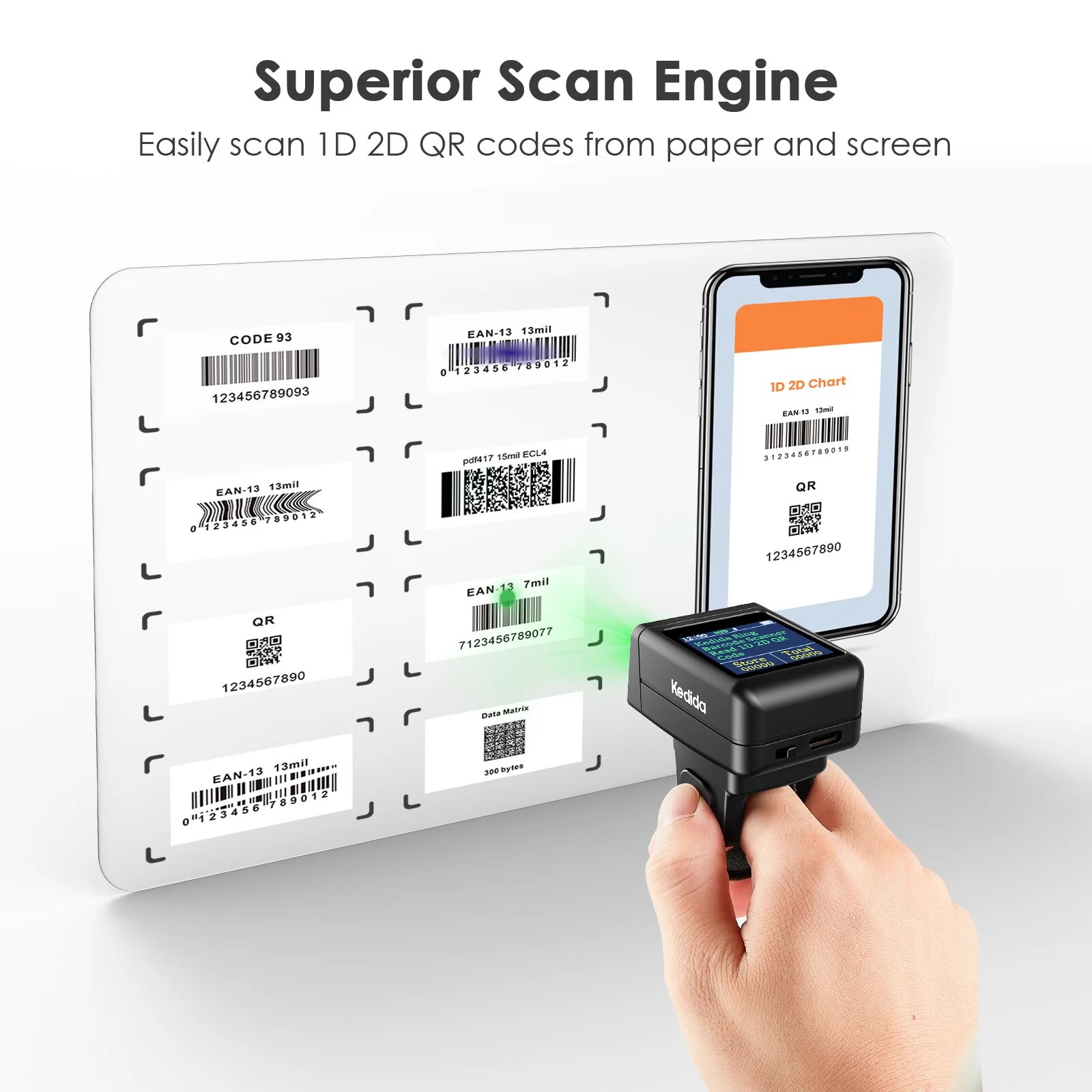 Беспроводной кольцевой сканер штрих-кода с дисплеем 1D 2D QR, 2D Scanner
