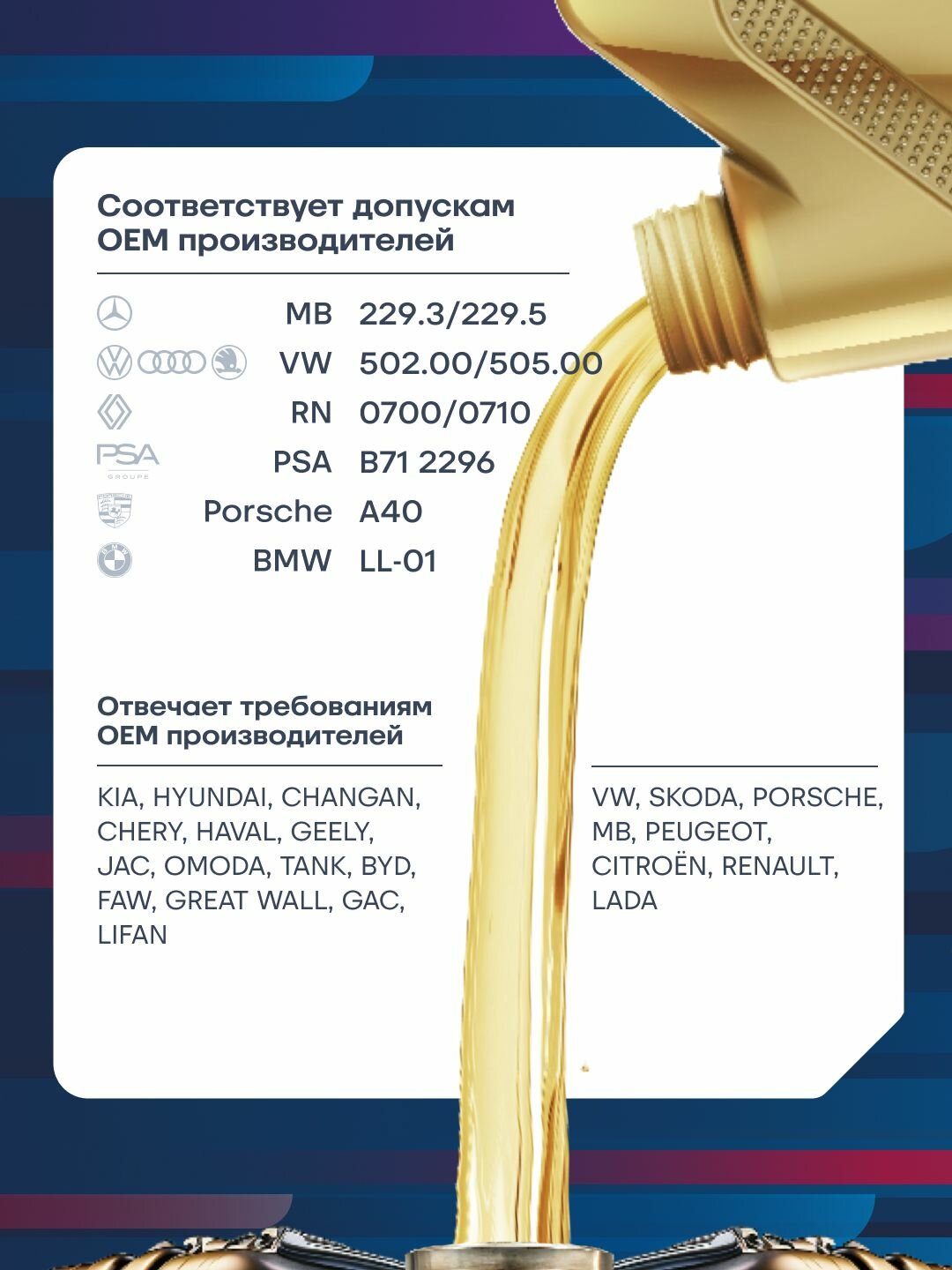 | Допуски OEM | BMW Longlife-01 / BMW Longlife-04 / GM Dexos 1 Gen 2 / MB 229.3 / MB 229.5 / PORSCHE A40 / PSA B71 2296 / VW 502.00/505.00 |
