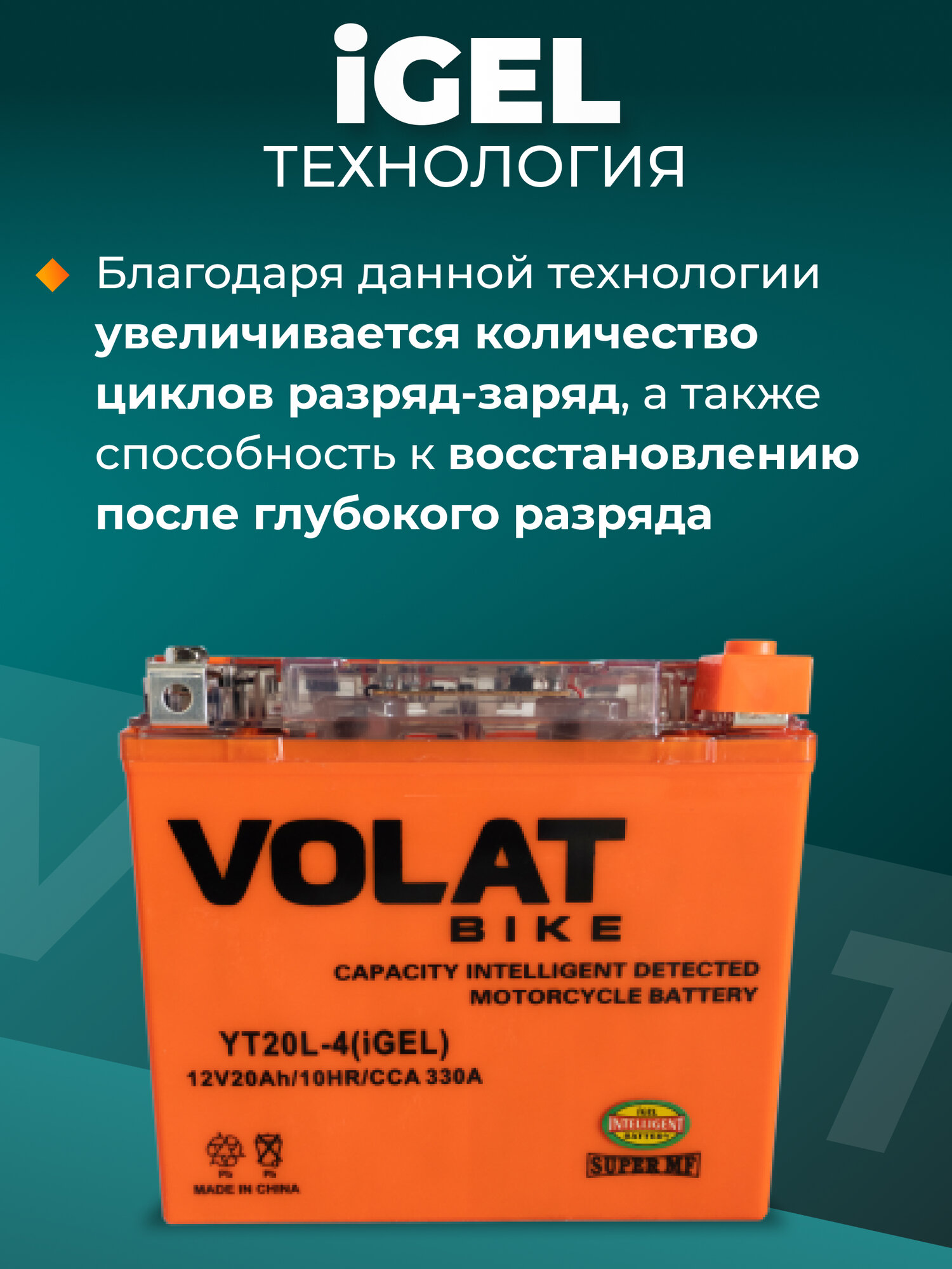 Аккумулятор для мотоцикла 12v Volat YT20-4(iGEL) прямая полярность 20 Ah 270 A гелевый, акб на скутер, мопед, квадроцикл, мотоцикл