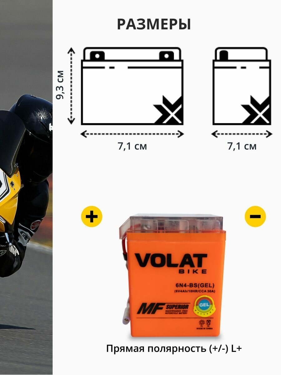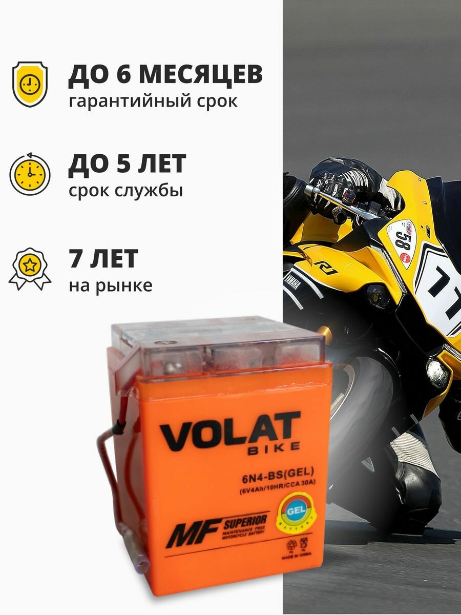 Купить Аккумулятор для мотоцикла 6v Volat 6N4-BS(GEL) прямая полярность 4 Ah 30 A гелевый, акб на скутер, мопед, квадроцикл 71x71x93 мм