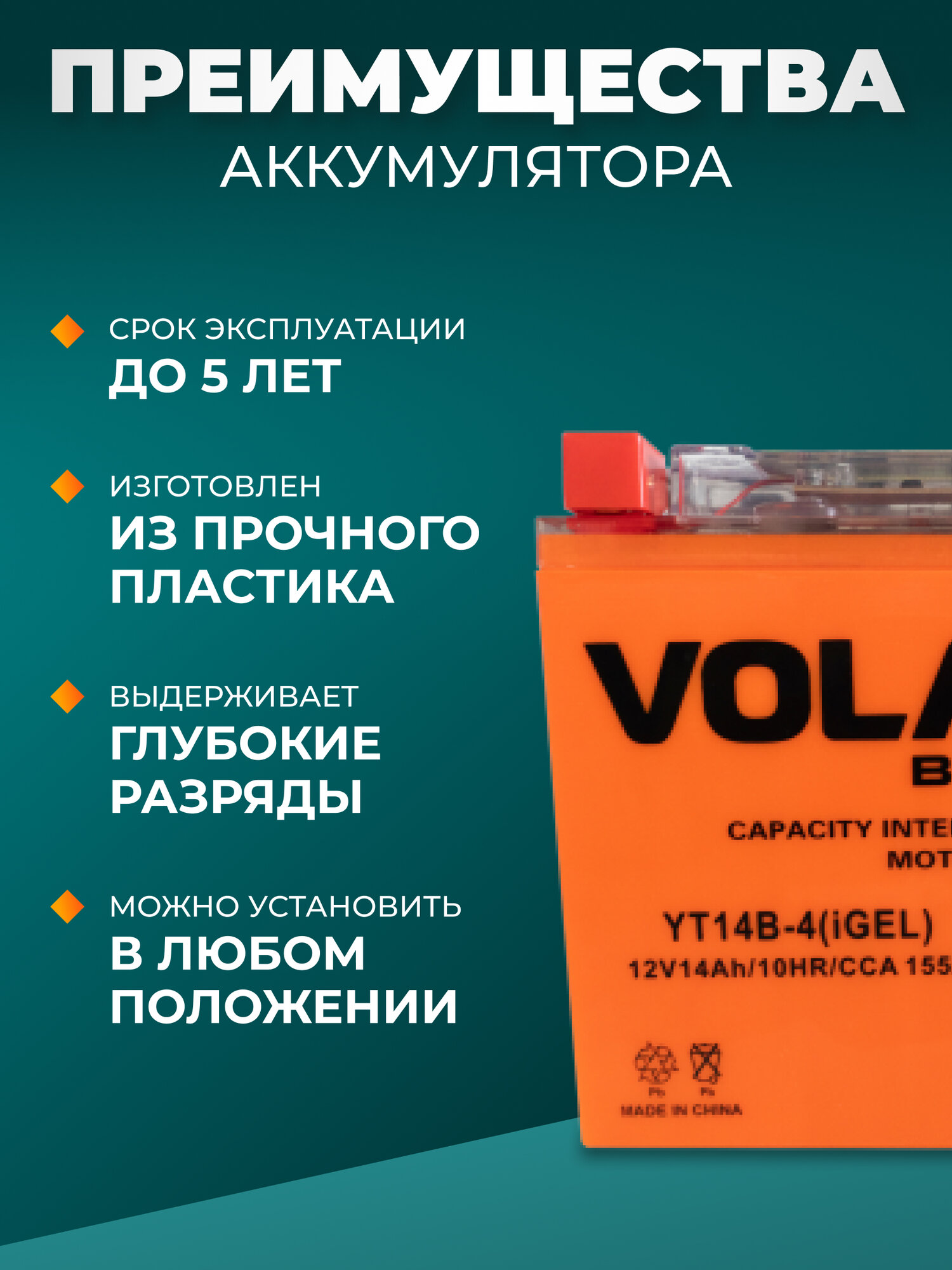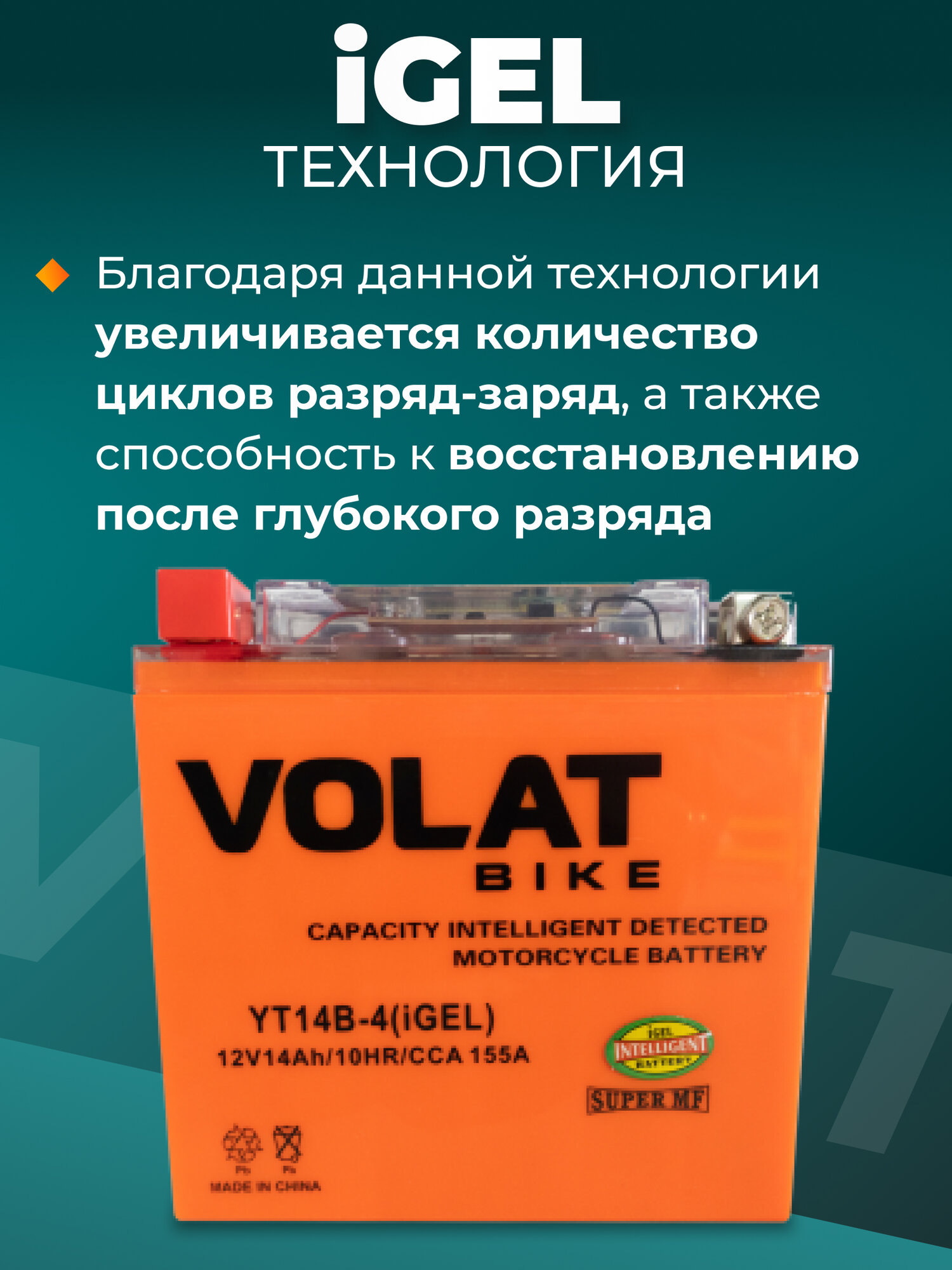 СохранитьАккумулятор для мотоцикла 12v Volat YT14B-4(iGEL) прямая полярность 14 Ah 155 A гелевый, акб на скутер, мопед, квадроцикл, мотоцикл интересное: