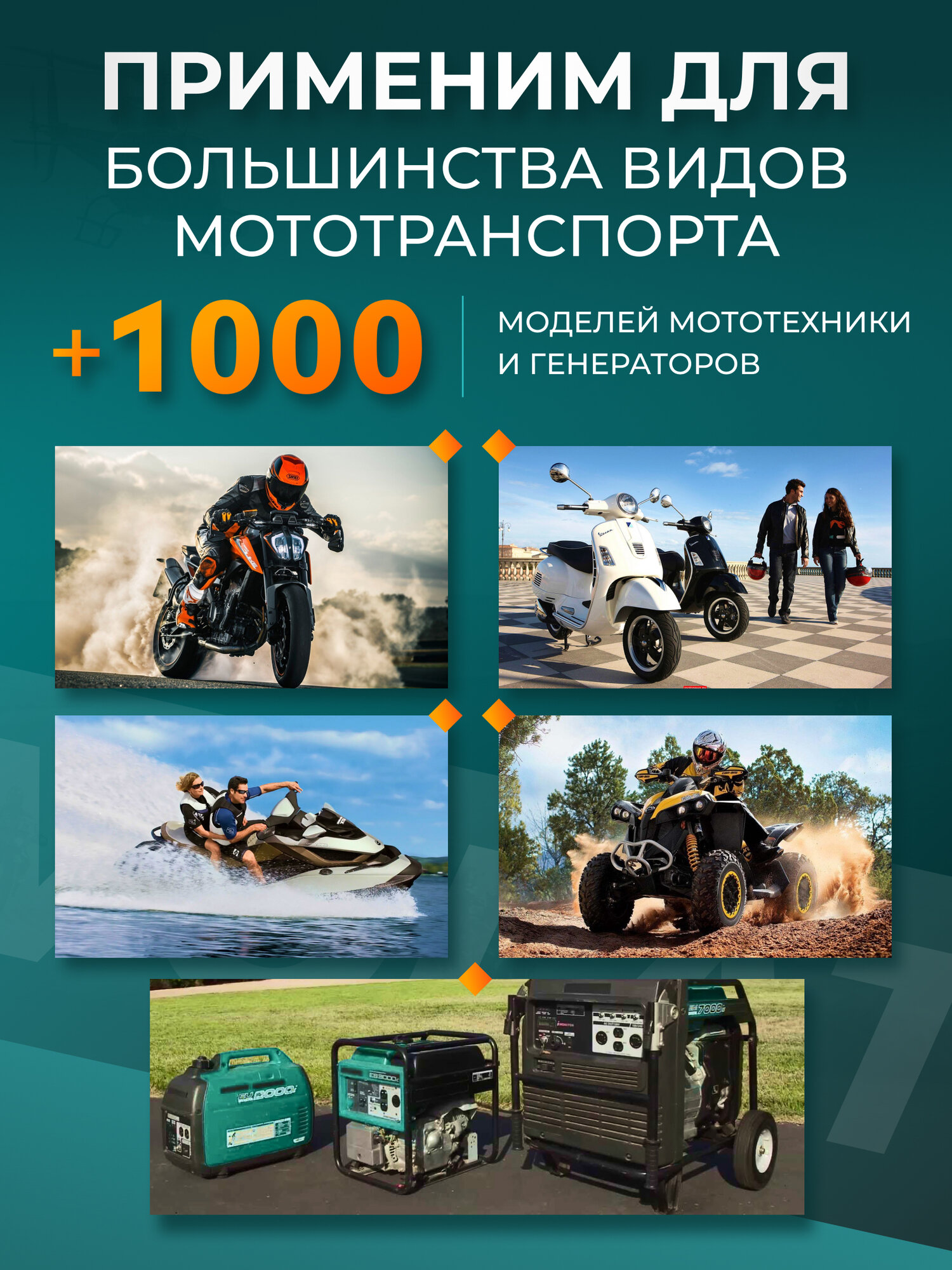 | Тип автотехники | водный транспорт / мототехника / генератор / квадроцикл / скутер |