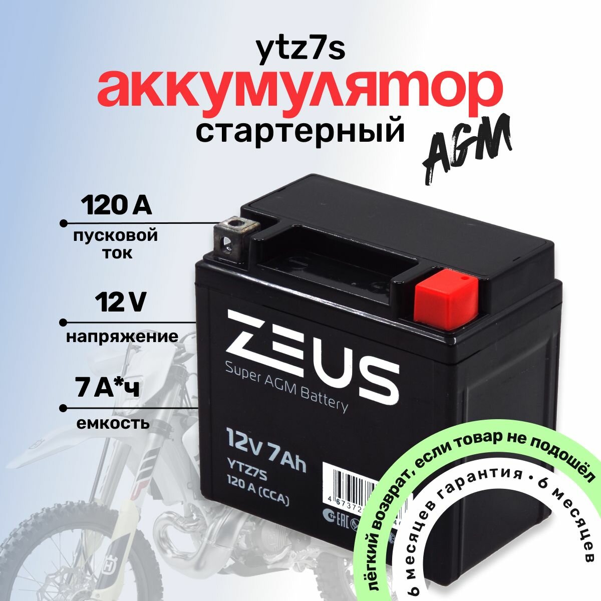 Купить Аккумулятор стартерный agm для мотоцикла/квадроцикла/скутера ZEUS SUPER AGM YTZ7S (12V/7Ah) (UTZ7S, СТ 1207.2)