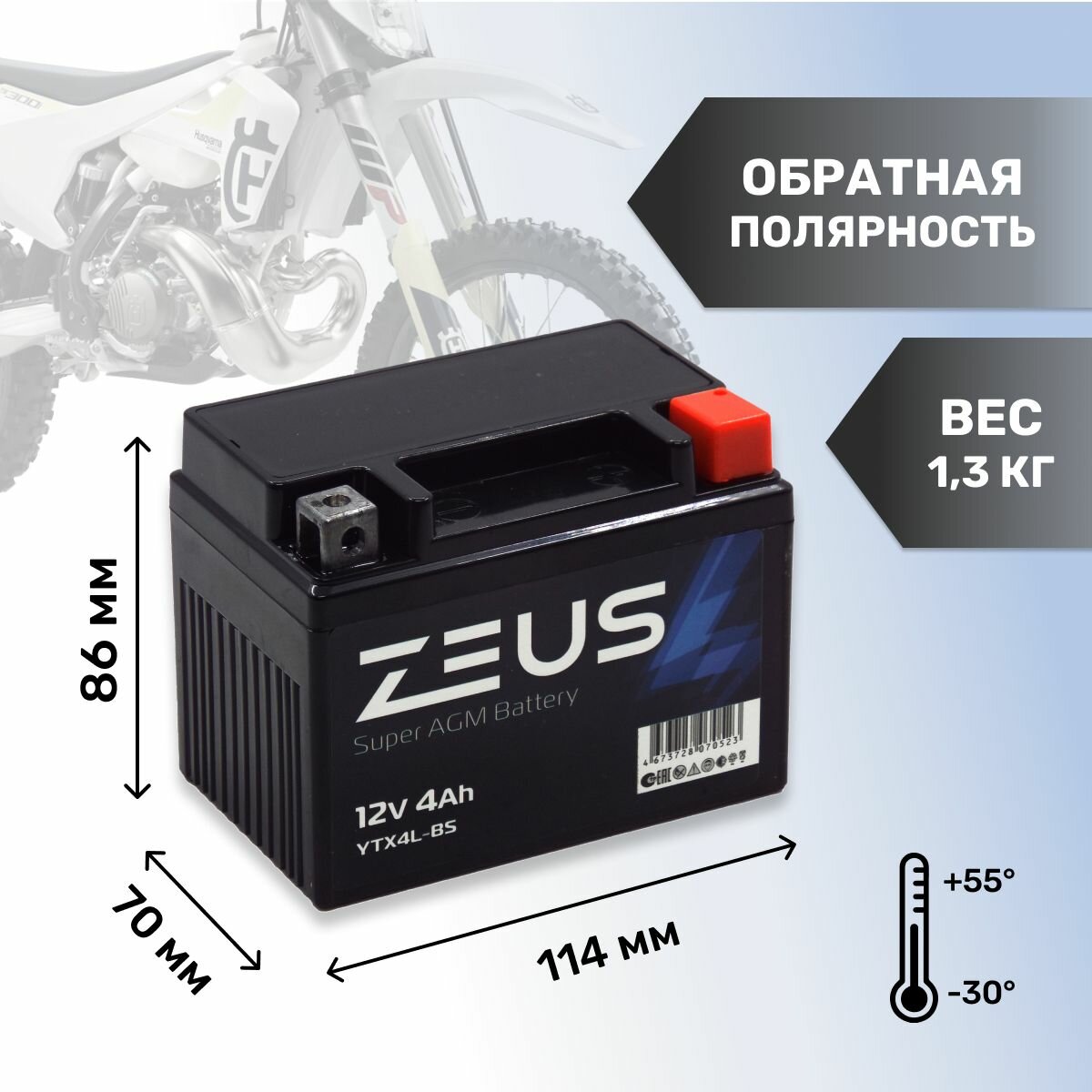 СохранитьАккумулятор стартерный AGM для мотоцикла/квадроцикла/скутера ZEUS SUPER AGM YTX4L-BS (12V/4Ah) (UTX4L-BS, СТ 1204) интересное:
