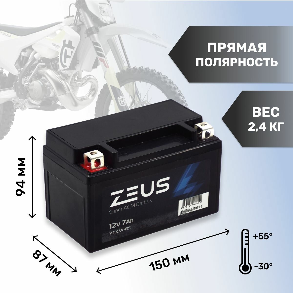 Аккумулятор стартерный agm для мотоцикла/квадроцикла/скутера ZEUS SUPER AGM YTZ7S (12V/7Ah) (UTZ7S, СТ 1207.2)