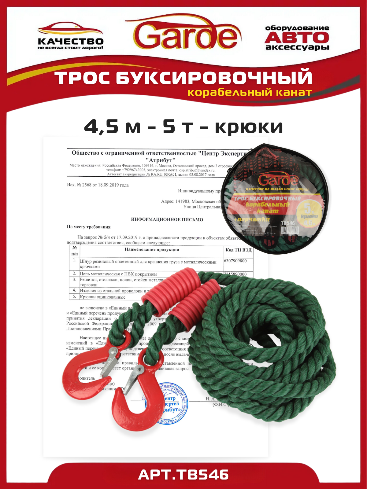 GARDE TB546 Трос буксировочный 5т Garde крюки 4,5м корабельный канат в сумке + перчатки TB546