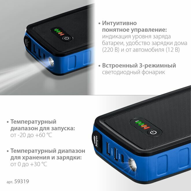 | Функции | встроенный фонарь / зарядка мобильных устройств (Powerbank) / подходит для AGM/GEL аккумуляторов |