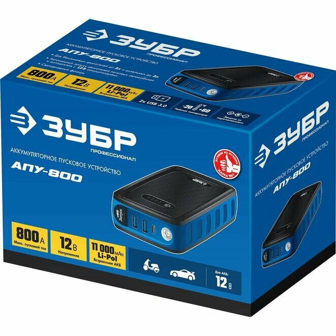 ЗУБР АПУ-800 аккумуляторное пусковое устройство: 12В, макс. 800А.