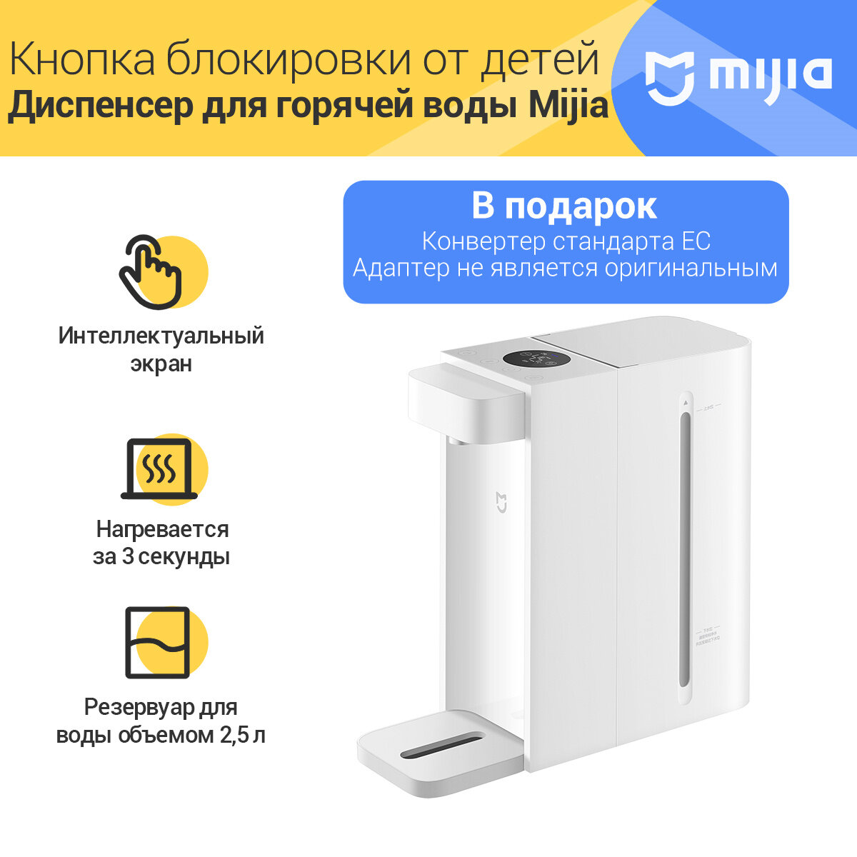 | Дополнительная информация | Объём 2.5 литра, нагревает воду за 3 секунды, 3 режима работы (нагрев до 95 градусов) |